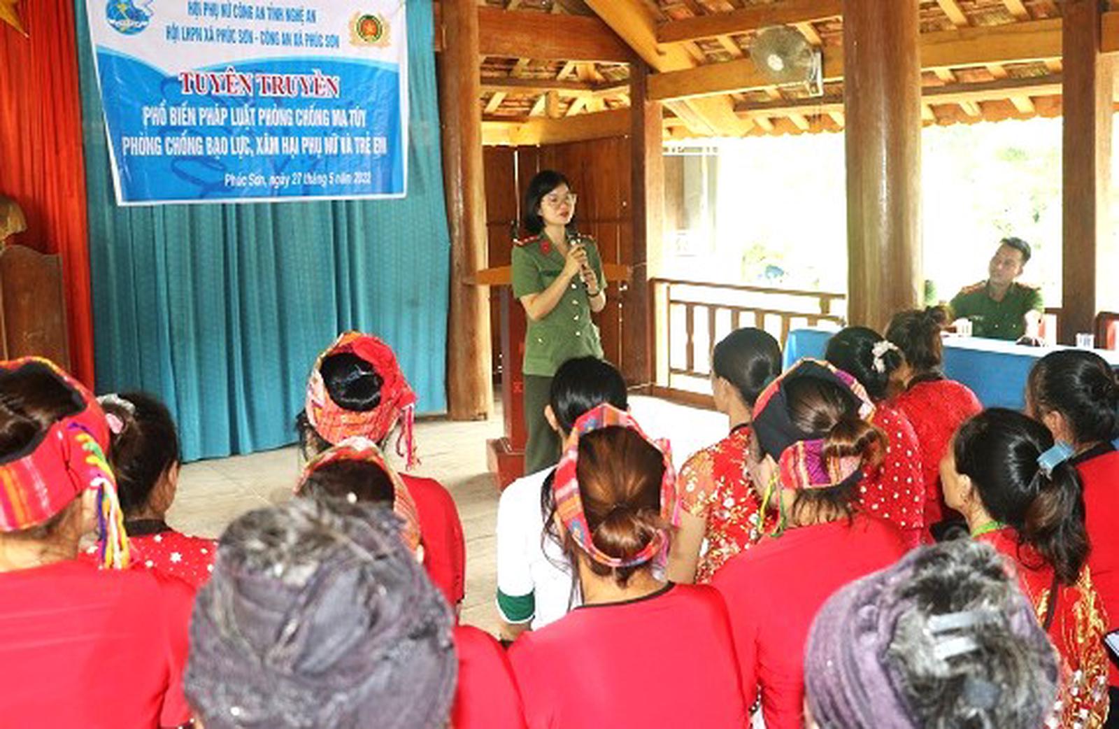 Các tổ chức, đoàn thể phối hợp tuyên truyền phòng, chống ma túy cho người dân xã biên giới Phúc Sơn, huyện Anh Sơn. Ảnh: HH