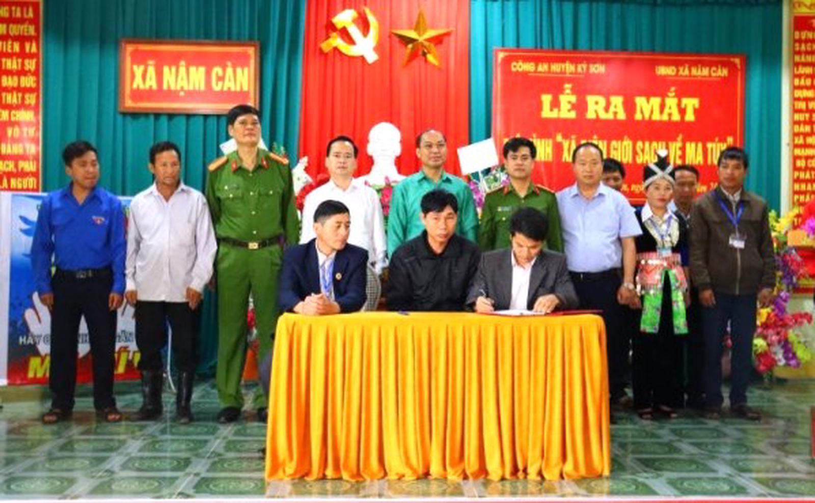 Ký cam kết trong phòng, chống ma túy tại lễ ra mắt mô hình "Xã biên giới sạch về ma túy" ở xã Nậm Càn, huyện Kỳ Sơn. Ảnh: Dương Tình