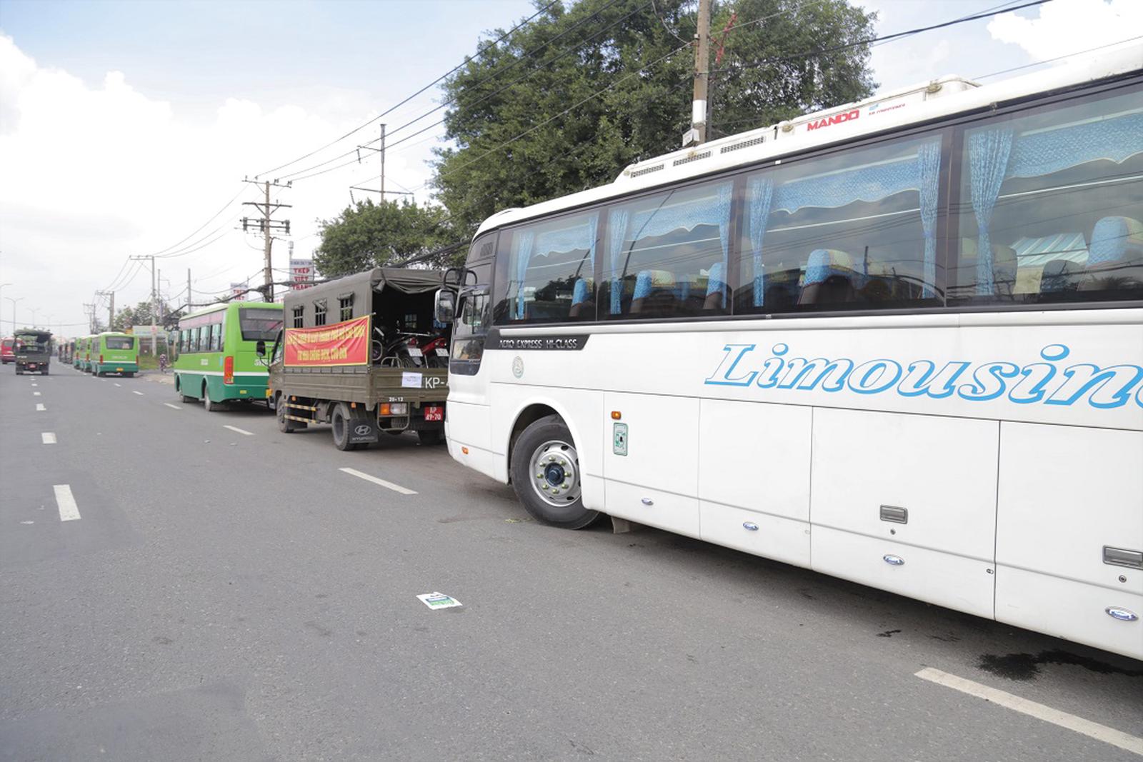 Lực lượng chức năng TP HCM huy động nhiều ô tô đến để trở người dân về quê. Ảnh: CTV