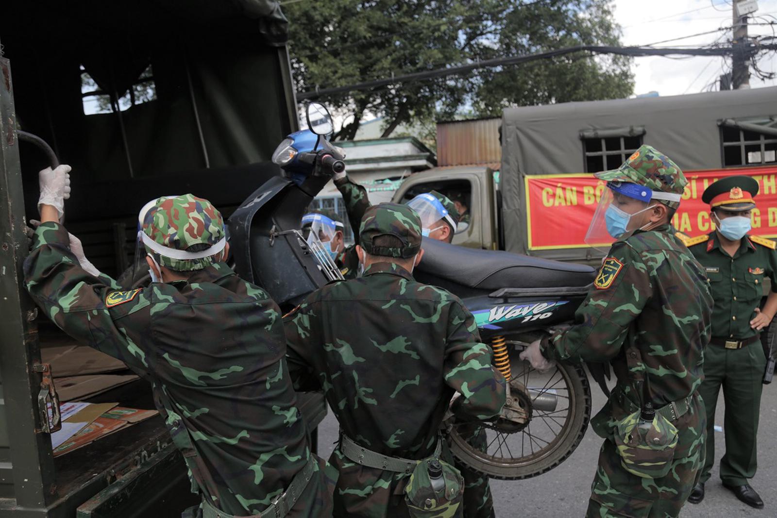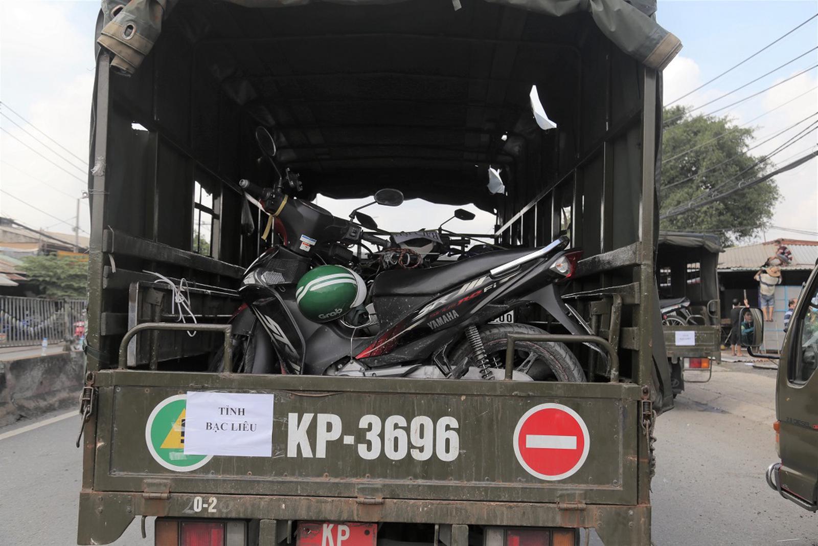 Bộ Tư lệnh TP HCM huy động các xe tải quân sự đến chở xe gắn máy của người dân… Ảnh: CTV