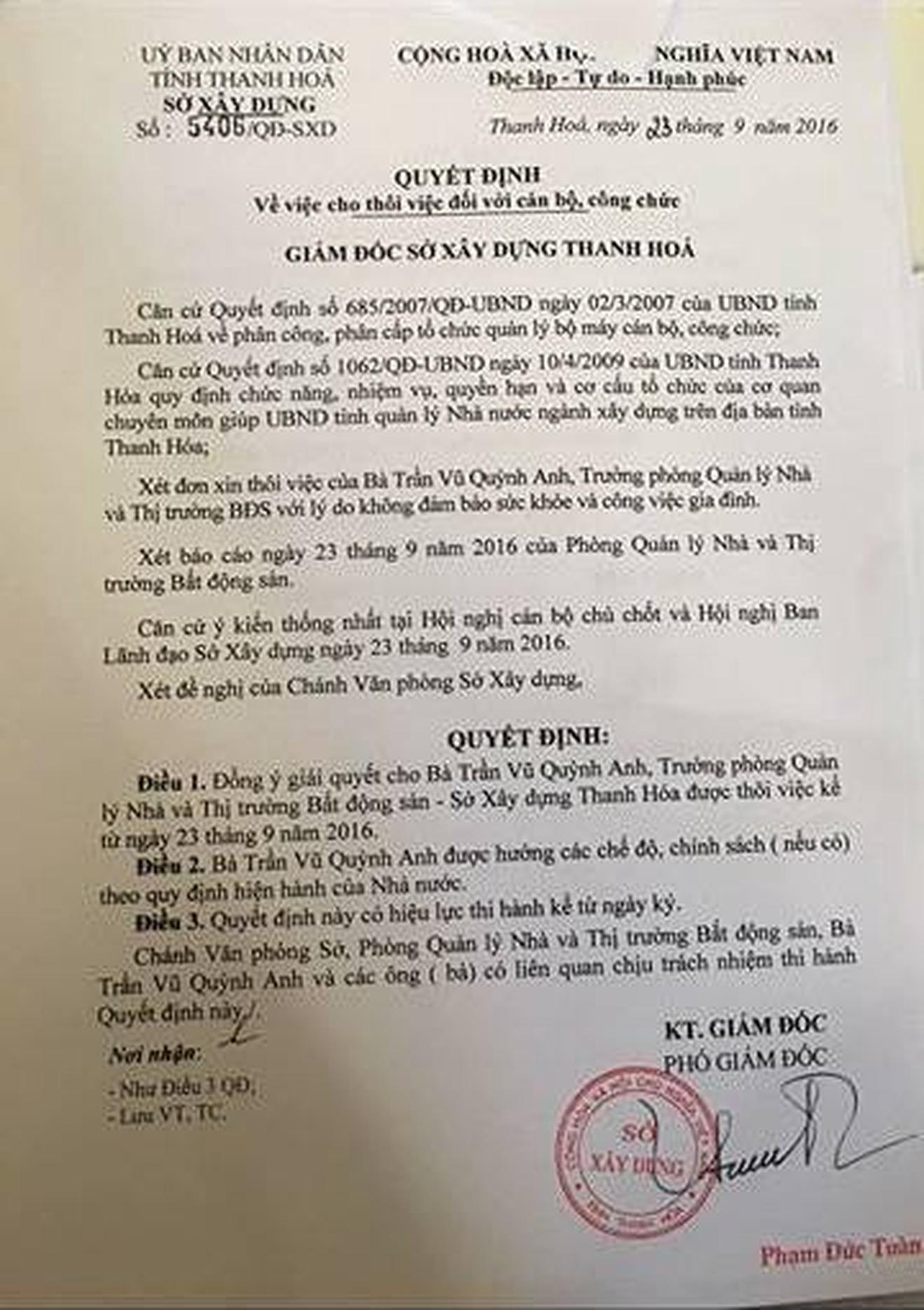 Quyết định cho thôi việc đối với bà Trần Vũ Quỳnh Anh. Ảnh: Intenet
