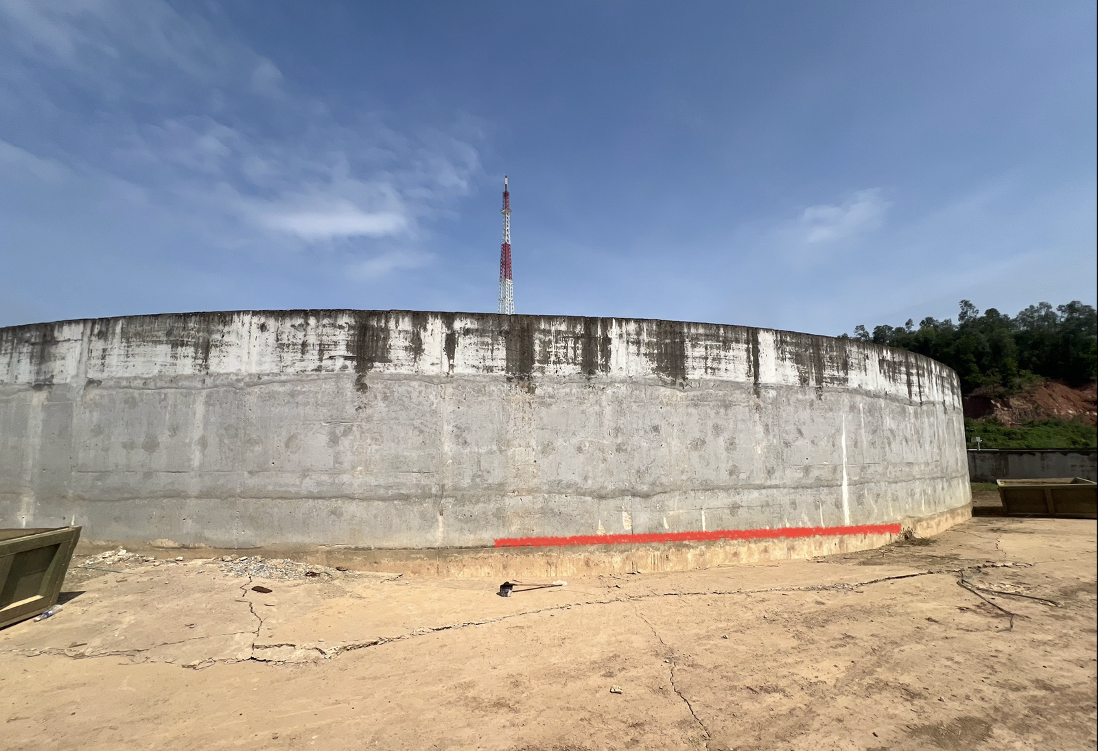 Bể lắng B của hệ thống xử lý nước thải bị đẩy nổi trong đợt lũ (phần dưới vạch đỏ) phải dừng hoạt động, đến nay chưa có phương án khắc phục. Ảnh: Thanh hoa