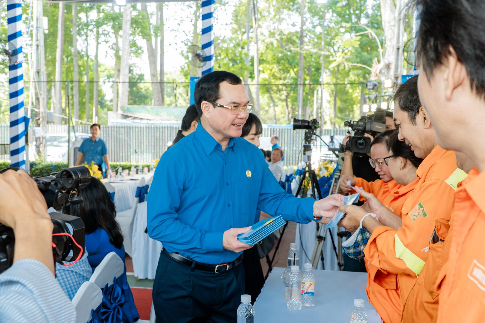 Chủ tịch Tổng LĐLĐ Việt Nam Nguyễn Đình Khang tặng quà cho công nhân, người lao động. Ảnh: NĐ