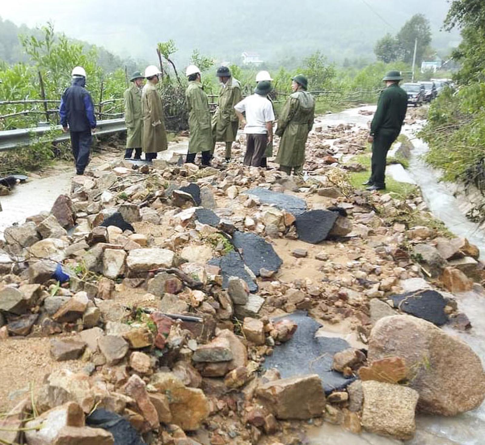 Lãnh đạo các địa phương kiểm tra tuyến đường sạt lở ở Vân Canh. Ảnh: Thanh Hòa