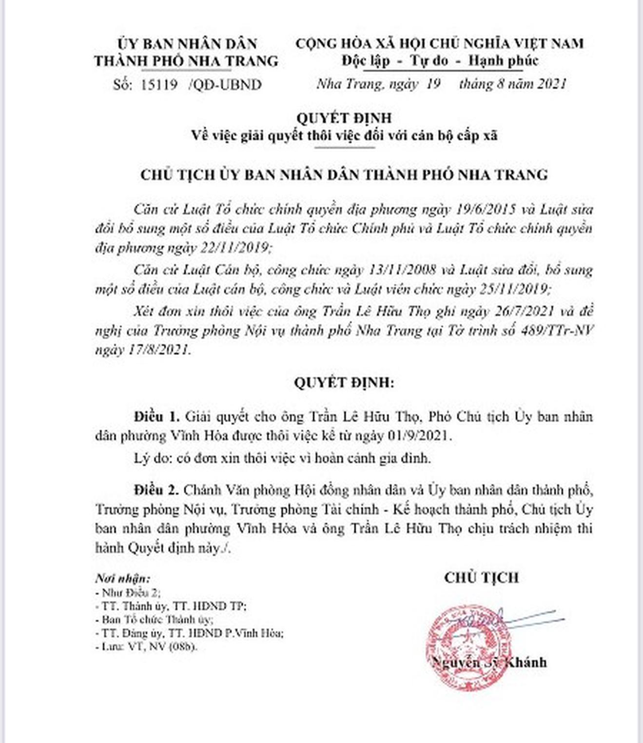 Quyết định của Chủ tịch UBND TP Nha Trang cho ông Trần Lê Hữu Thọ nghỉ việc từ ngày 1/9. Ảnh: Thanh Hòa