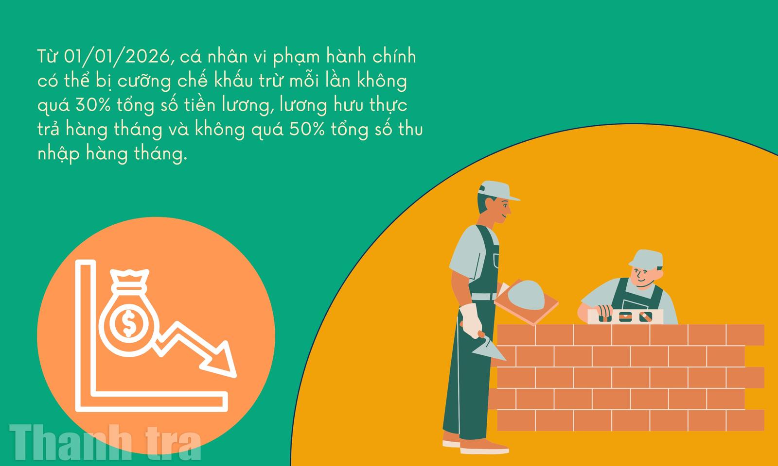 Như vậy, từ 1/1/2026, cá nhân vi phạm hành chính có thể bị cưỡng chế khấu trừ mỗi lần không quá 30% tổng số tiền lương, lương hưu thực trả hàng tháng và không quá 50% tổng số thu nhập hàng tháng.