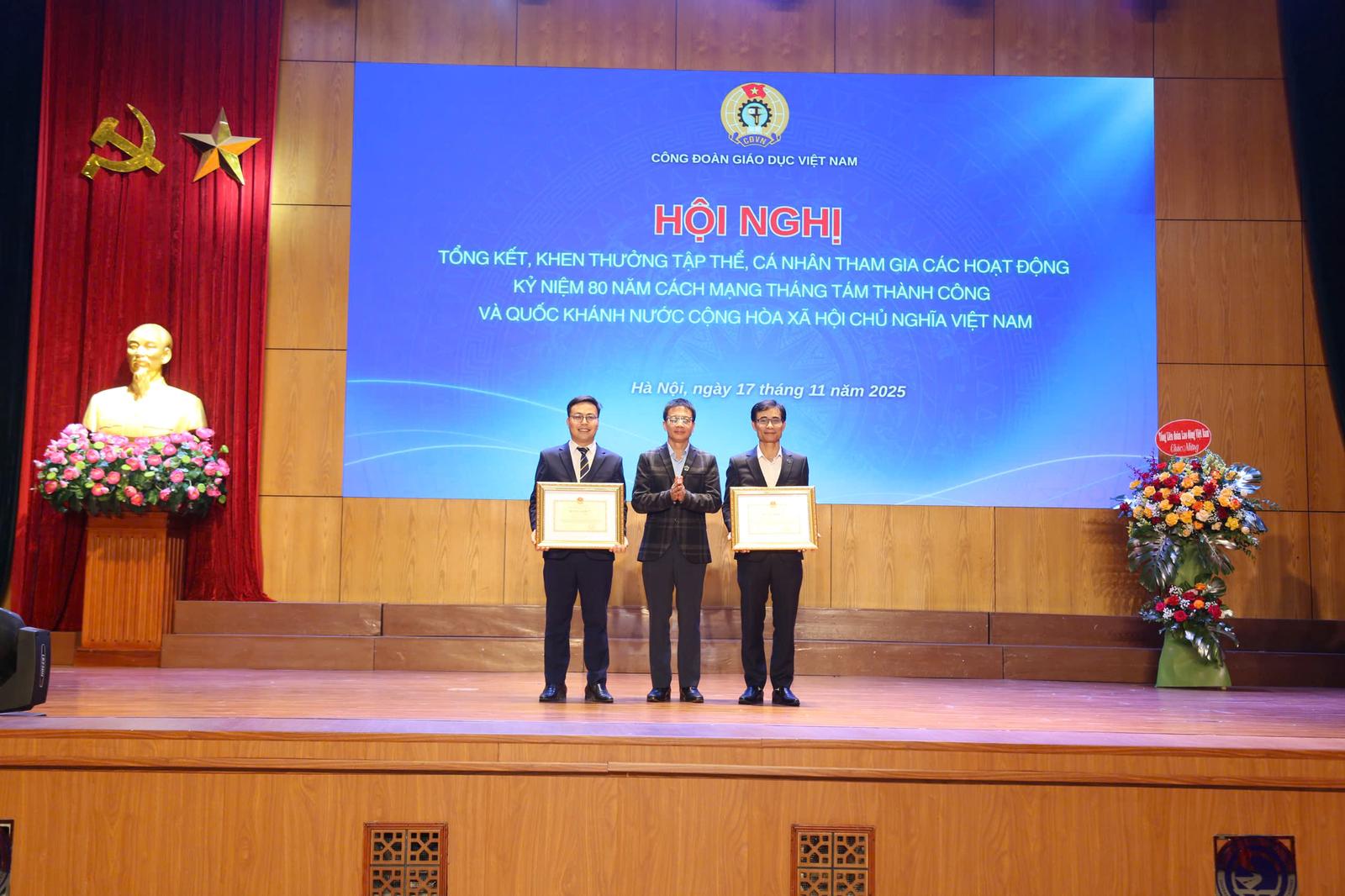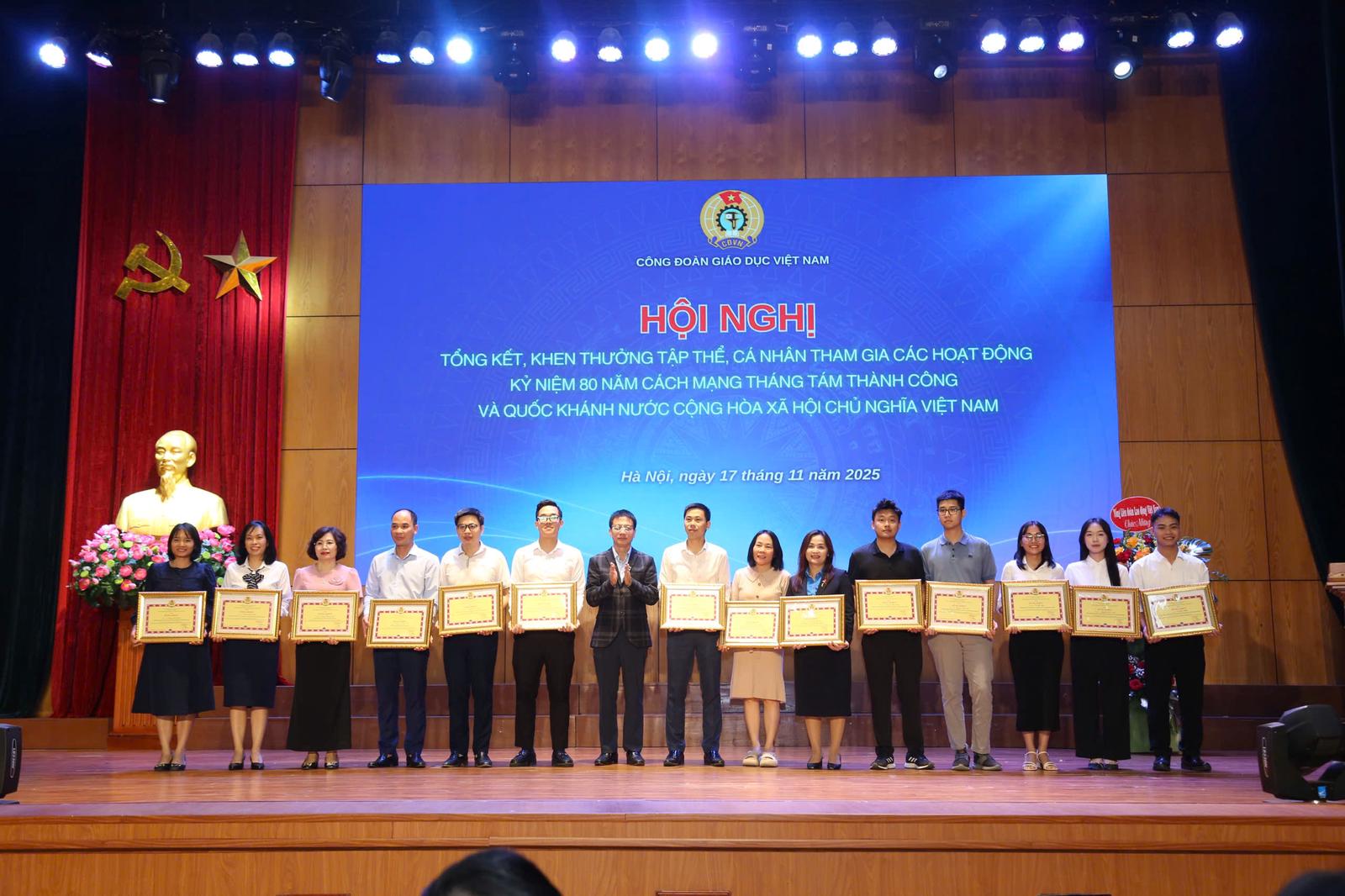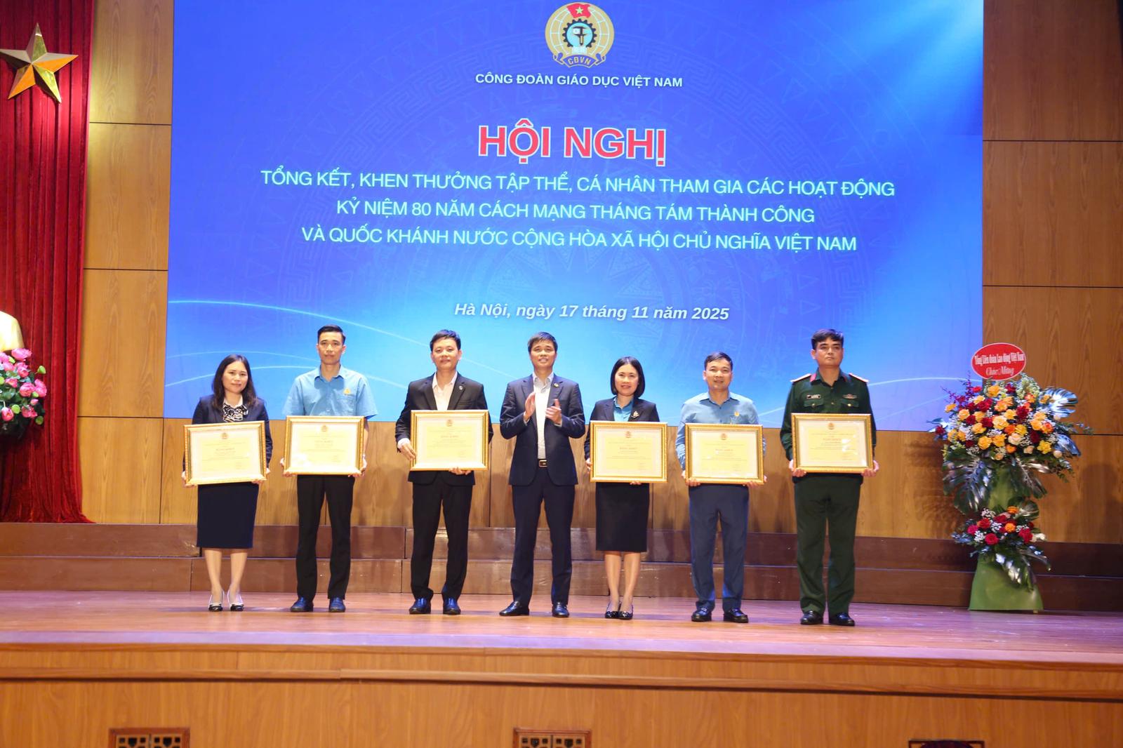 (Thanh tra) - Ngày 17/11, Công đoàn Giáo dục Việt Nam tổ chức Hội nghị tổng kết, khen thưởng các tập thể, cá nhân tham gia hoạt động kỷ niệm A80. Dịp này đã có 3 tập thể, 13 cá nhân nhận bằng khen của Tổng Liên đoàn Lao động Việt Nam; 13 tập thể, 28 cá nhân nhận bằng khen của Bộ Giáo dục và Đào tạo; 2 tập thể, 17 cá nhân nhận bằng khen của Công đoàn Giáo dục.