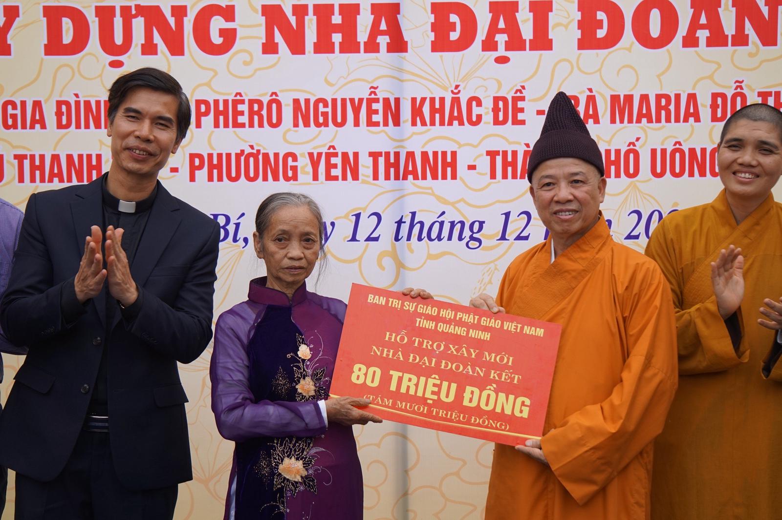 (Thanh tra)- Trong dịp lễ Giáng sinh năm nay, Hòa thượng Thích Thanh Quyết, Phó Chủ tịch Hội đồng Trị sự Giáo hội Phật giáo Việt Nam, Trưởng ban Trị sự Phật giáo Quảng Ninh trao kinh phí hỗ trợ xây dựng nhà đại đoàn kết hộ gia đình ông Phêrô Nguyễn Khắc Đề - bà Maria Đỗ Thị Mái.
