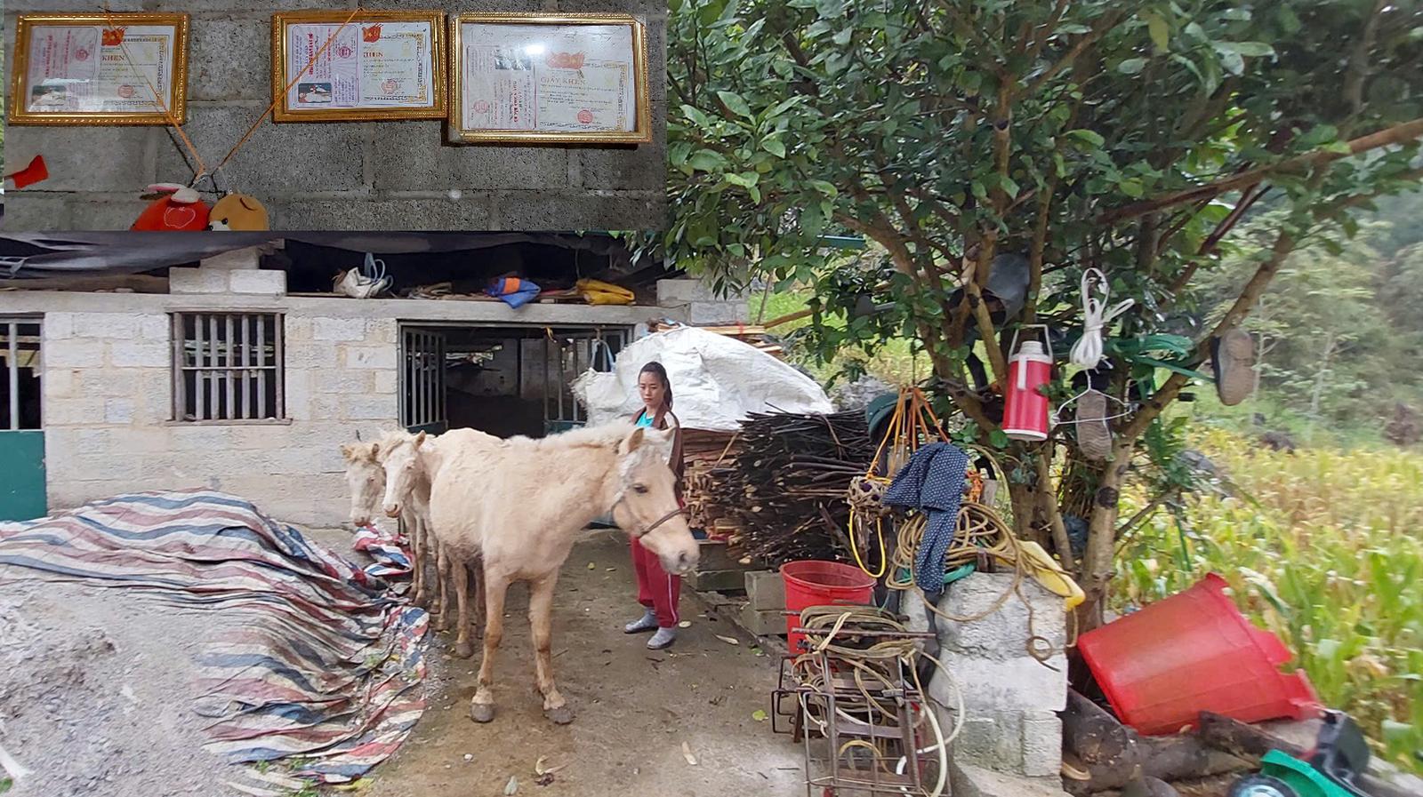 Chị Dương Thị Lưu bên đàn ngựa bạch, vật nuôi chủ lực giúp gia đình cải thiện đời sống, thu nhập. Ảnh: Trung Hà