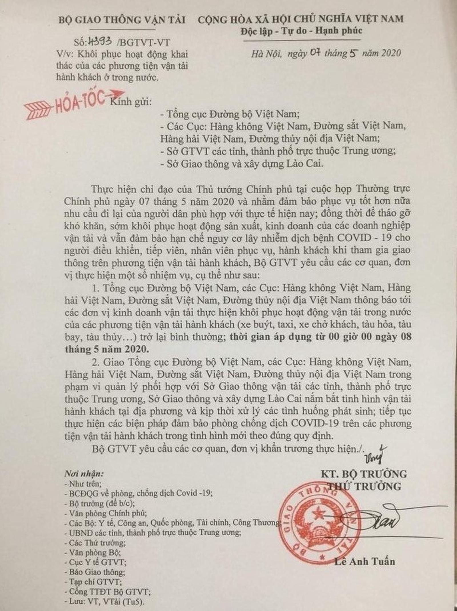 Tổng cục Đường bộ Việt Nam, các Cục: Hàng không Việt Nam, Hàng hải Việt Nam, Đường sắt Việt Nam, Đường thủy nội địa Việt Nam thông báo tới các đơn vị kinh doanh vận tải thực hiện khôi phục hoạt động vận tải trong nước của các phương tiện vận tải hành khách (xe buýt, taxi, xe chở khách, tàu hỏa, tàu bay, tàu thủy...) trở lại bình thường; thời gian áp dụng từ 00 giờ 00 ngày 8/5.