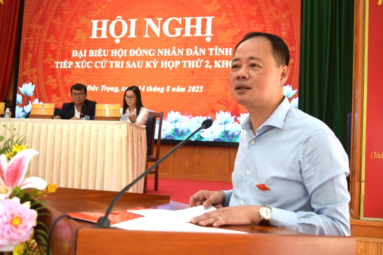 Phát biểu tại buổi tiếp xúc, Phó Bí thư Tỉnh ủy, Chủ tịch HĐND tỉnh Lâm Đồng Trần Hồng Thái đánh giá cao vai trò, trách nhiệm và sự quan tâm sâu sát của cử tri đối với các vấn đề phát triển của xã nhà nói riêng và tỉnh Lâm Đồng nói chung. Đồng thời, ghi nhận và kiến nghị một số nhóm vấn đề chính được các cử tri quan tâm.