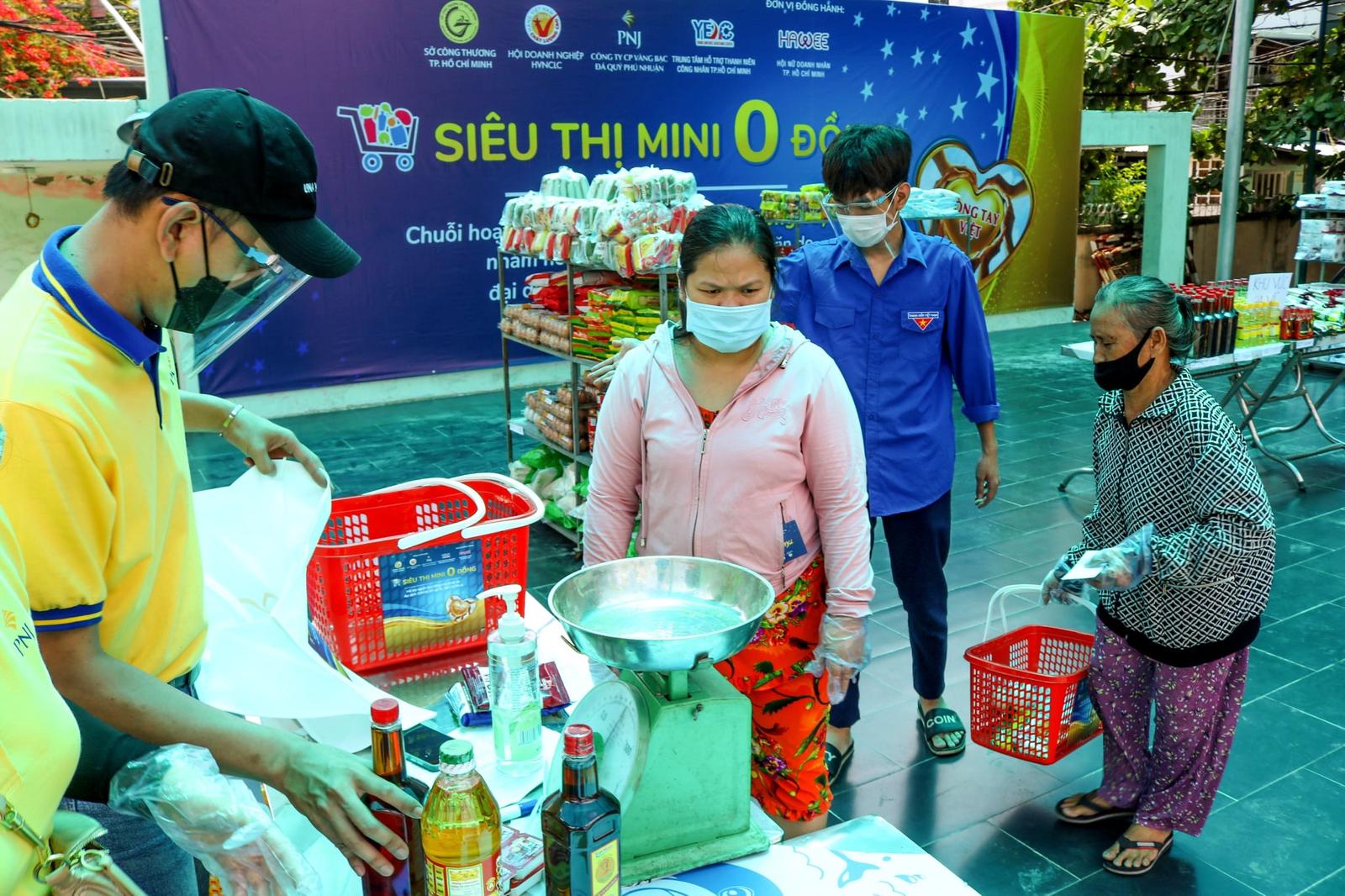 Người dân TP Hồ Chí Minh mua sắm miễn phí nhu yếu phẩm tại chợ 0 đồng do doanh nghiệp phối hợp với chính quyền tổ chức hỗ trợ đời sống cho người nghèo (tháng 6/2021). Ảnh: tuoitre.vn