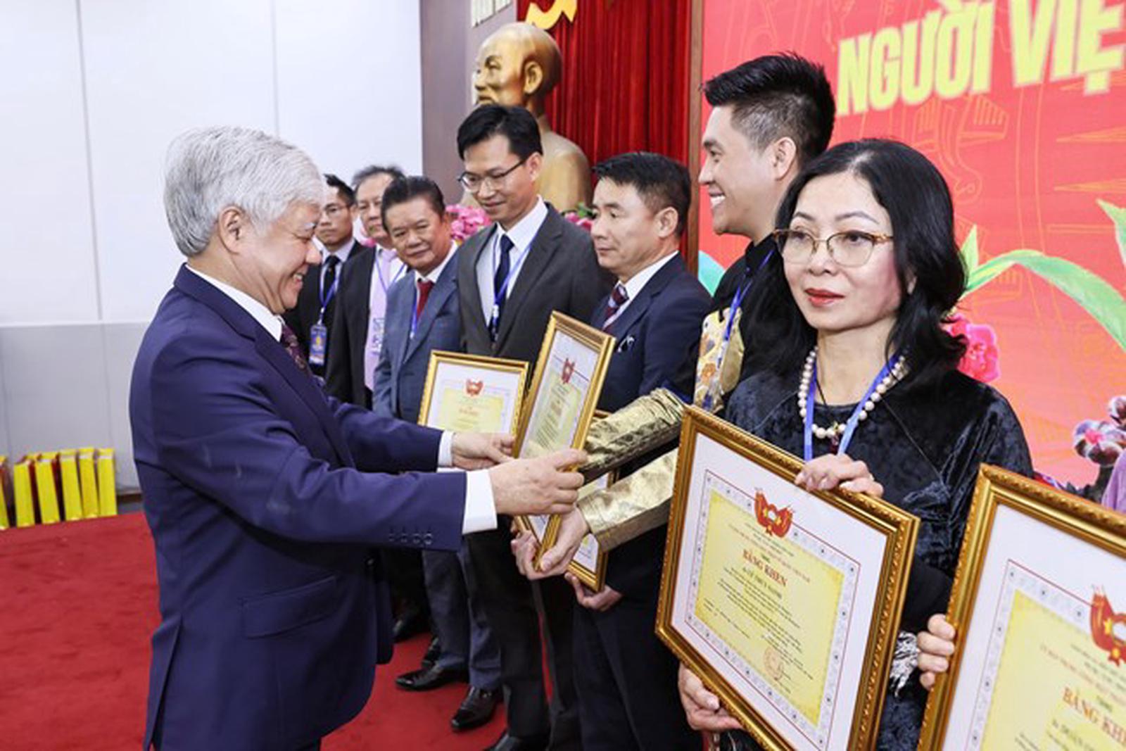 Chủ tịch MTTQ Việt Nam Đỗ Văn Chiến trao bằng khen cho kiều bào tiêu biểu. Ảnh: Q.Vinh