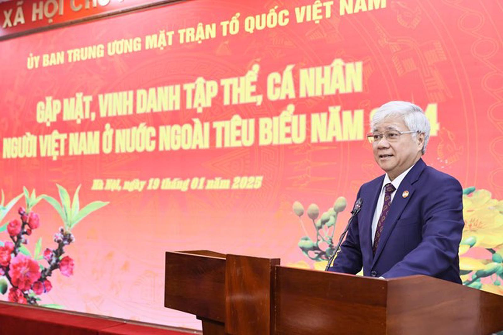 (Thanh tra) - Hôm nay (19/1), Chủ tịch Ủy ban Trung ương (UBTƯ) Mặt trận Tổ quốc (MTTQ) Việt Nam Đỗ Văn Chiến đã nhấn mạnh như vậy tại buổi gặp mặt vinh danh tập thể, cá nhân người Việt Nam ở nước ngoài tiêu biểu, nhân dịp kiều bào về nước tham dự chương trình Xuân Quê hương năm 2025.