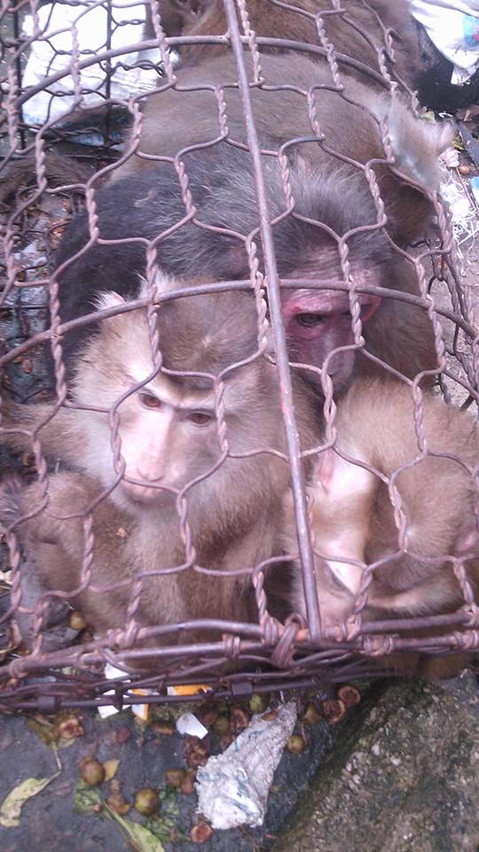 Các cá thể khỉ bị nhốt trong lồng trước khi bị mang ra "hóa kiếp" . Ảnh chụp Facebook
