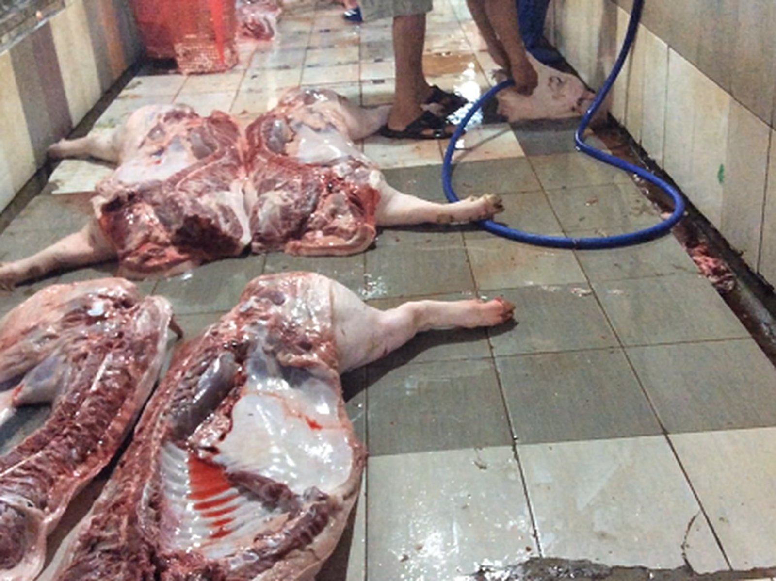 Cảnh tượng những người giết mổ lợn cởi áo xoay trần lấm láp mồ hôi, không có trang thiết bị an toàn vệ sinh, dùng chân đi ủng dẫm, gạt thịt và lòng heo giữa nền lò mổ khá phổ biến, nhưng không thấy cán bộ thú y hay kiểm dịch đến kiểm soát.