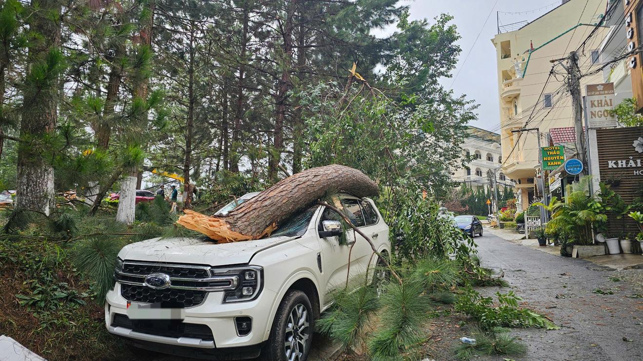 Một cành thông lớn gãy đổ vào chiếc xe 7 chỗ đang đậu làm hư hỏng nặng. Ảnh: Vũ Linh