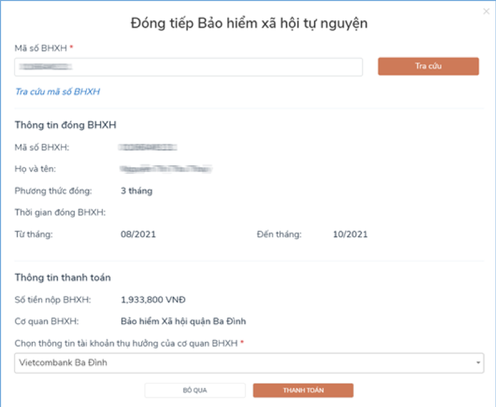- Bước 4: Nhập mã số BHXH rồi click nút "Tra cứu". Nếu nhập đúng mã số BHXH, thông tin về người tham gia, phương thức đóng, thời gian đóng và thông tin về cơ quan BHXH sẽ được hiển thị để bạn kiểm tra. Ở bước này, bạn lựa chọn Ngân hàng thụ hưởng của cơ quan BHXH. Tiếp đó, bạn bấm nút "Thanh toán".