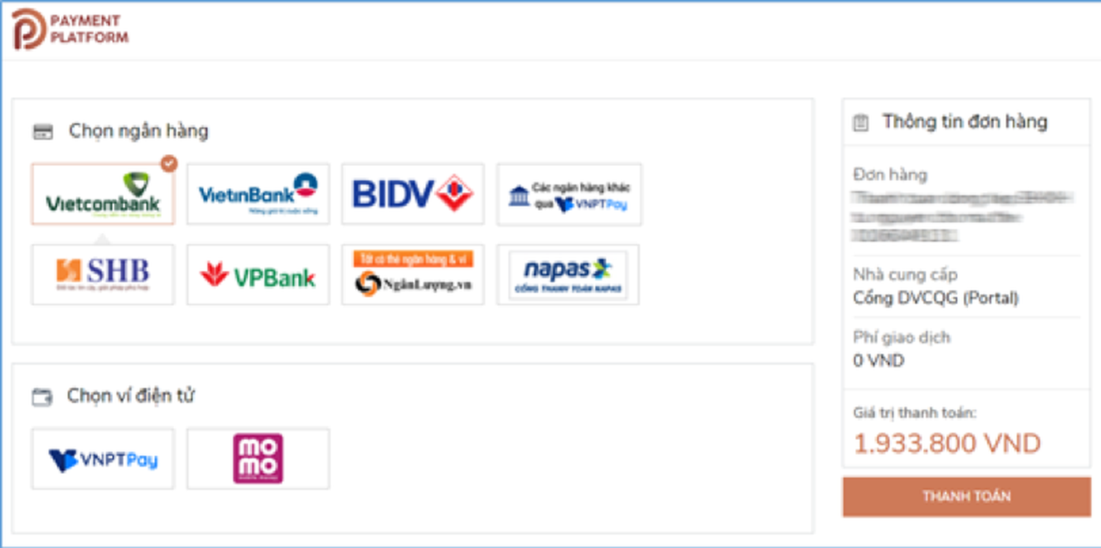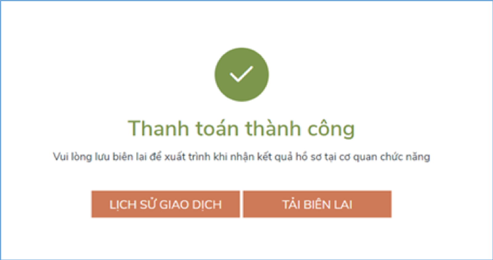 + Khi thanh toán thành công, hệ thống sẽ điều hướng quay trở lại giao diện của Cổng DVC Quốc gia với thông báo "Thanh toán thành công".