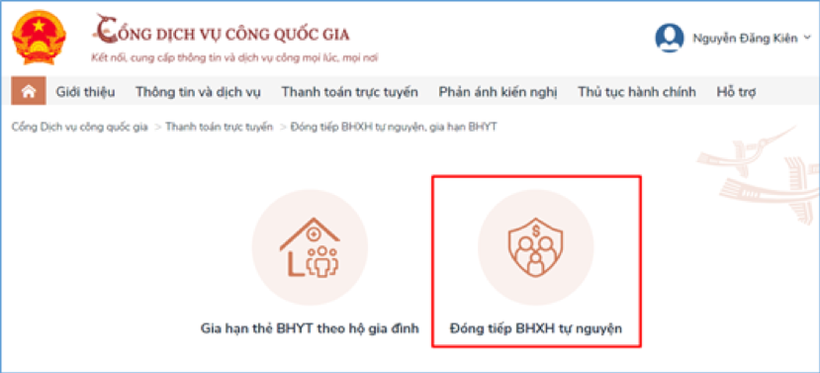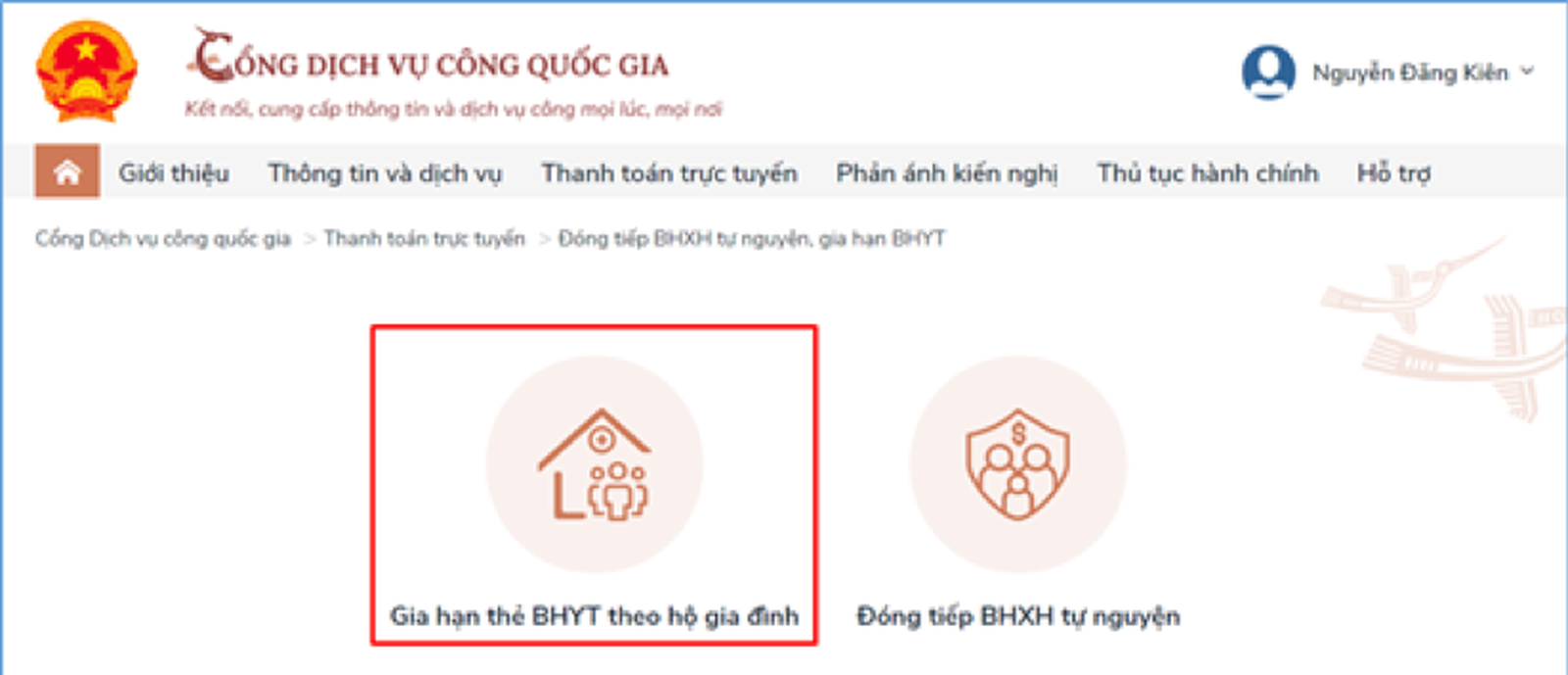 Trước tình hình đại dịch Covid-19 còn diễn biến phức tạp tại nhiều địa phương trên cả nước, để giúp người tham gia BHXH tự nguyện, BHYT hộ gia đình có thể nộp tiền gia hạn thẻ BHYT, đóng tiếp tiền tham gia BHXH tự nguyện đảm bảo duy trì quá trình tham gia liên tục, BHXH Việt Nam vừa có hướng dẫn thực hiện dịch vụ thanh toán trực tuyến để gia hạn thẻ BHYT theo hộ gia đình và đóng tiếp BHXH tự nguyện trên Cổng DVC Quốc gia.