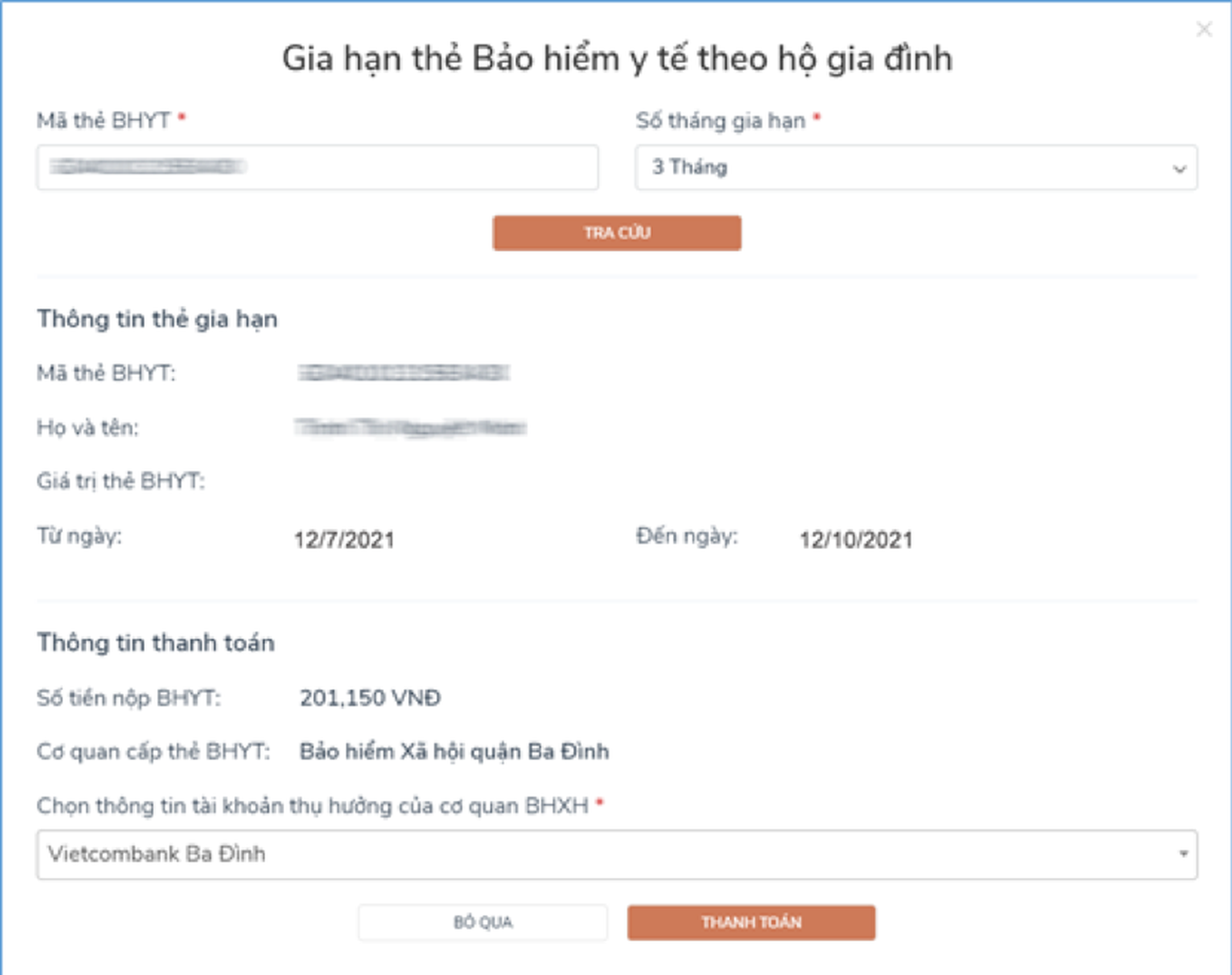 - Bước 4: Nhập mã thẻ BHYT, chọn số tháng muốn gia hạn và thực hiện tra cứu. Sau khi bạn nhập đúng thông tin, màn hình sẽ hiển thị thông tin tra cứu theo mã thẻ BHYT đã nhập.
