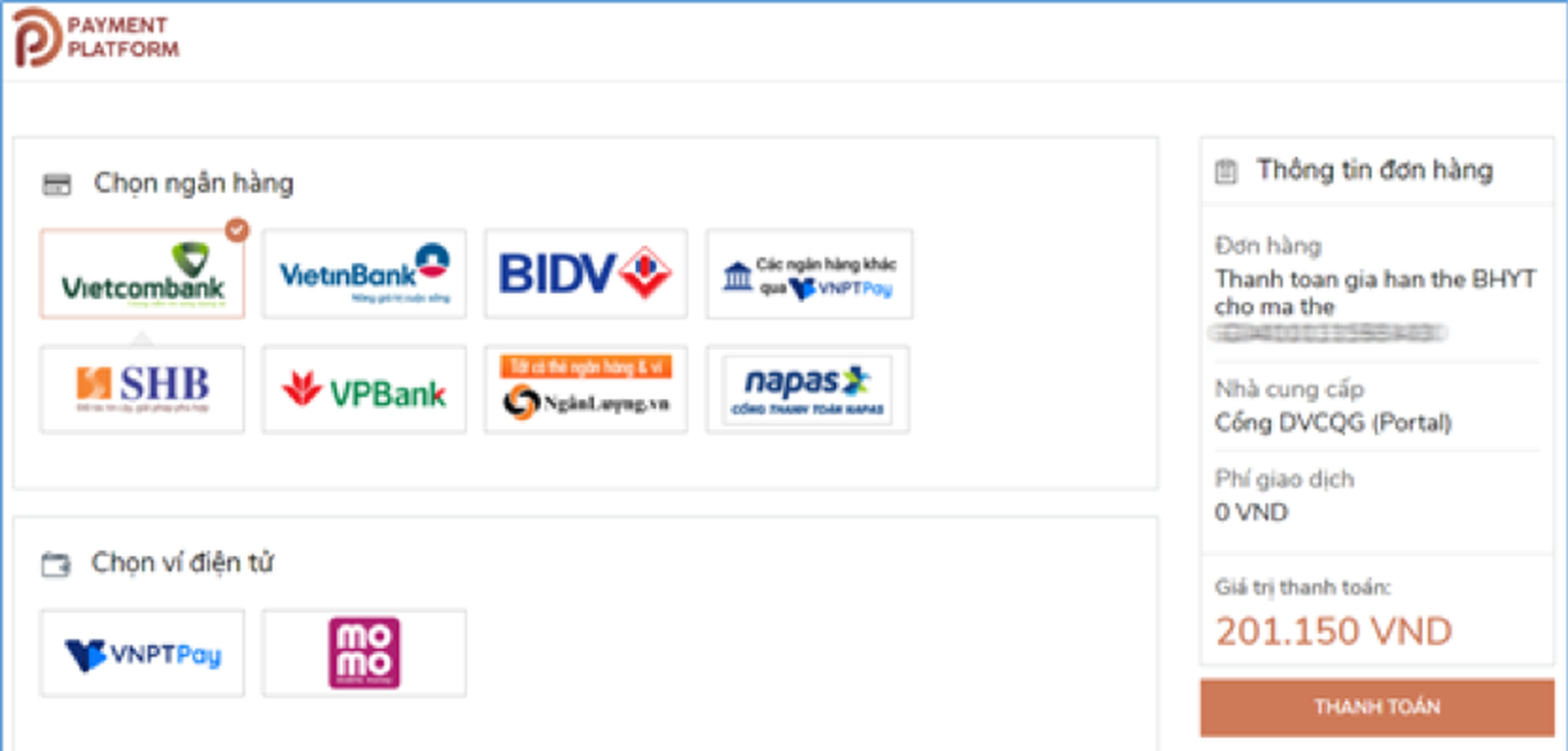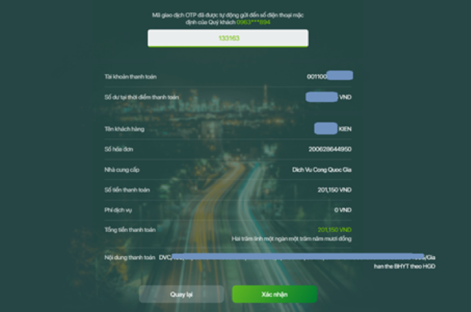 Các thao tác trên giao diện Internet Banking của Ngân hàng bạn thực hiện tương tự như dịch vụ thanh toán “Gia hạn thẻ BHYT theo hộ gia đình”.