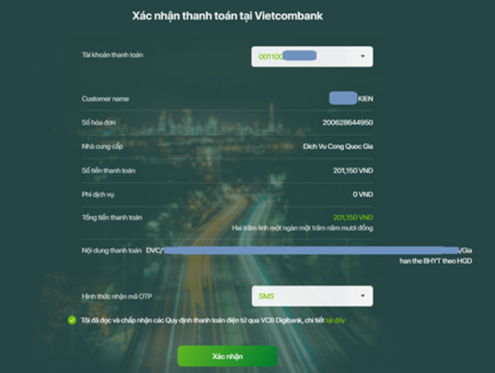 + Hệ thống sẽ hiển thị lại thông tin thanh toán một lần nữa để xác nhận. Nếu các thông tin đã chính xác, nhấn vào nút "Xác nhận".