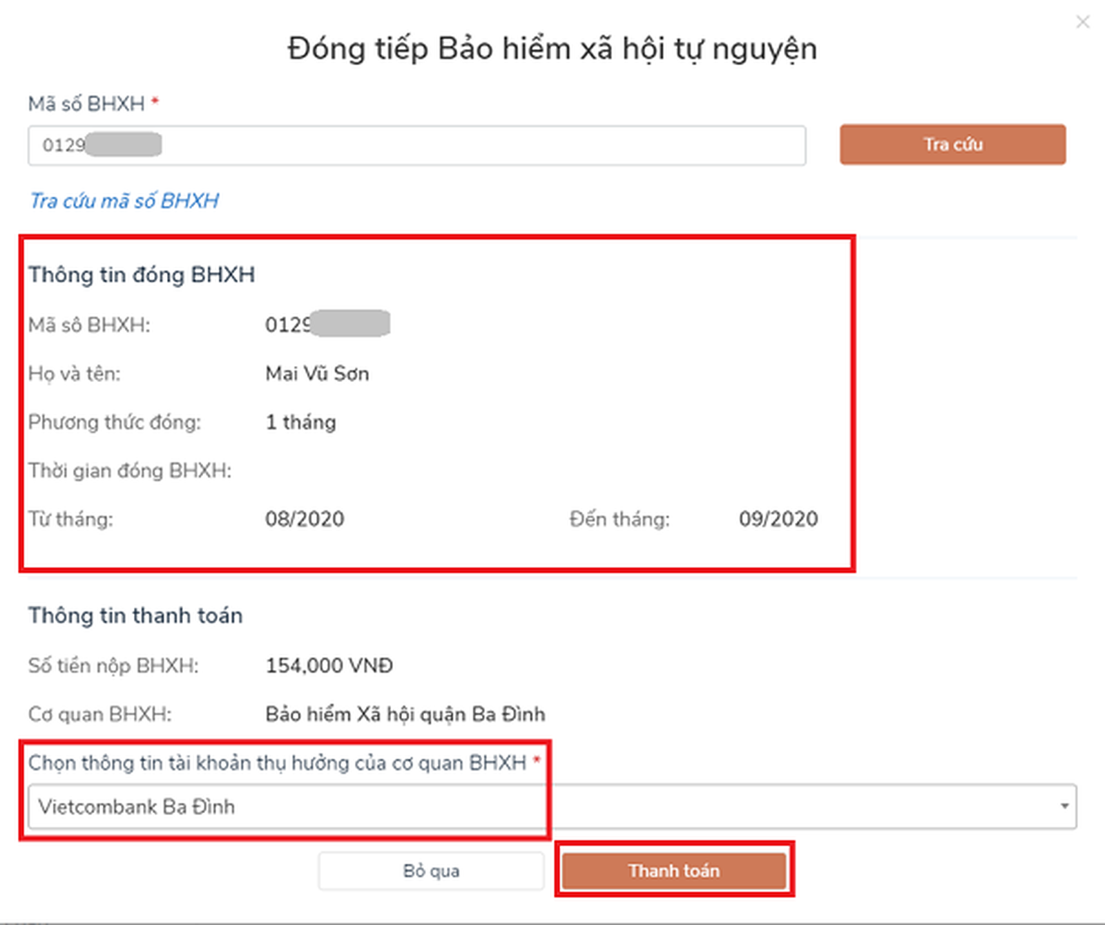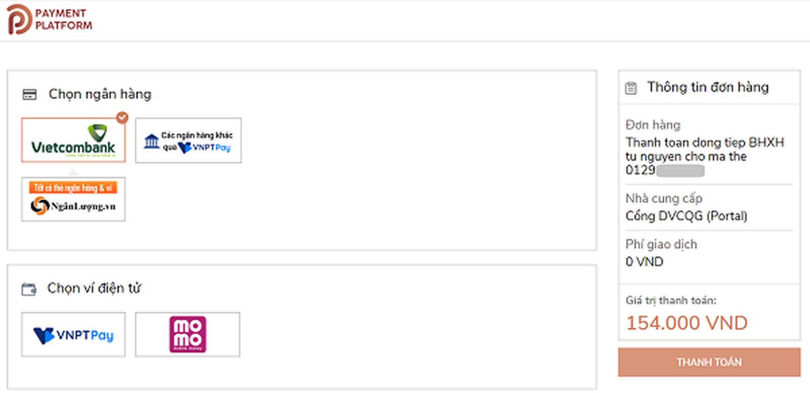 Như vậy, người dẫn đã thực hiện thành công dịch vụ thanh toán trực tuyến của BHXH tích hợp, cung cấp trên Cổng Dịch vụ công quốc gia.