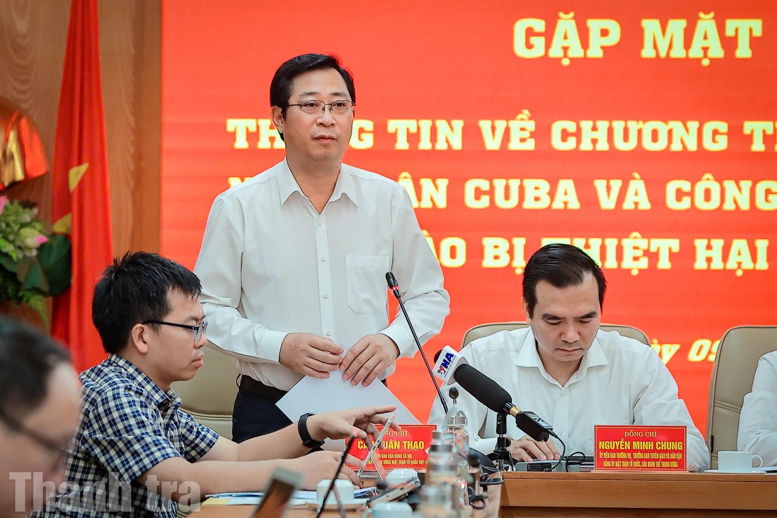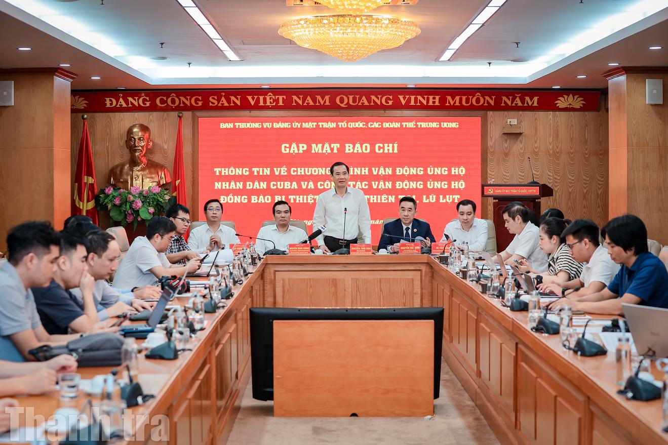 (Thanh tra) - Sáng 9/10, Ban Thường vụ Đảng ủy MTTQ, các đoàn thể Trung ương tổ chức cuộc gặp mặt thông tin đến các cơ quan thông tấn báo chí về kết quả vận động ủng hộ bước đầu của đồng bào và chiến sĩ cả nước, đồng bào ta ở nước ngoài, các cơ quan, tổ chức, các doanh nghiệp, các nhà hảo tâm ở trong và ngoài nước, người nước ngoài đang sinh sống, làm việc ở Việt Nam đối với chương trình vận động ủng hộ Nhân dân Cuba với chủ đề “65 năm nghĩa tình Việt Nam - Cuba" và sự chung tay ủng hộ đồng bào bị thiệt hại do cơn bão số 10 (Bualoi) gây ra.