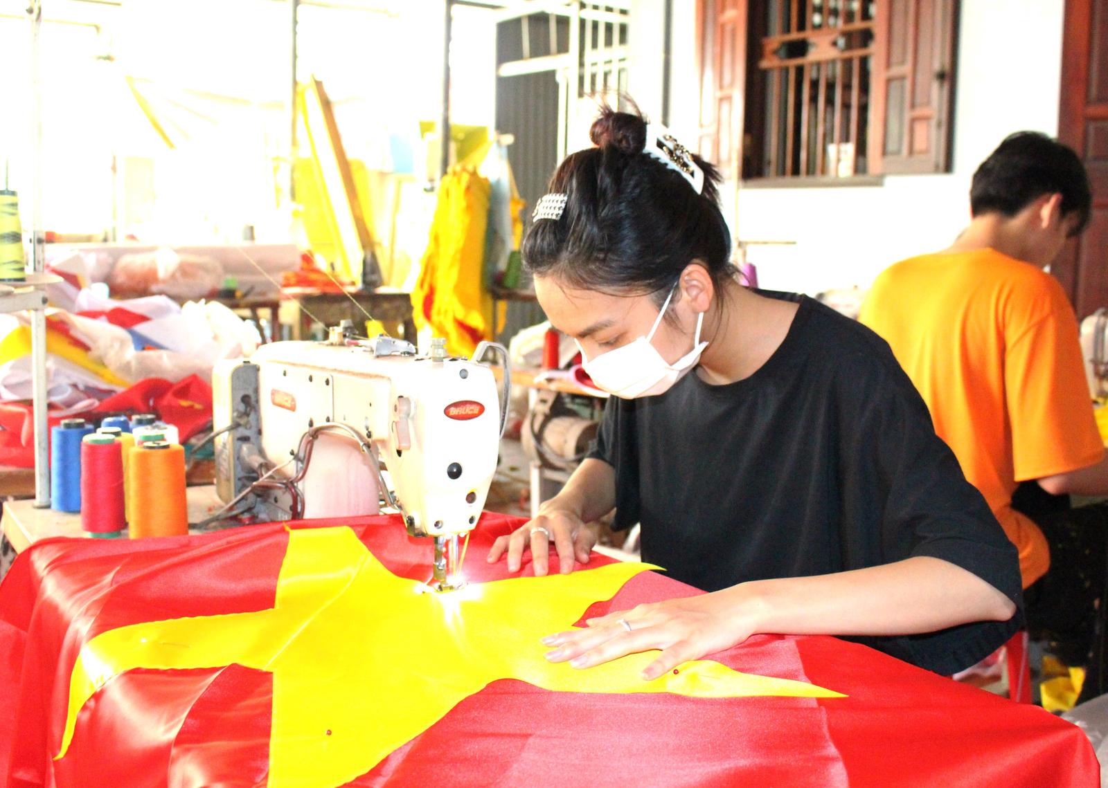 Tiếng máy khâu dồn dập, tiếng cắt vải xoèn xoẹt - những âm thanh đã trở nên quá đỗi quen thuộc với người dân quanh năm rợp bóng cờ hoa.