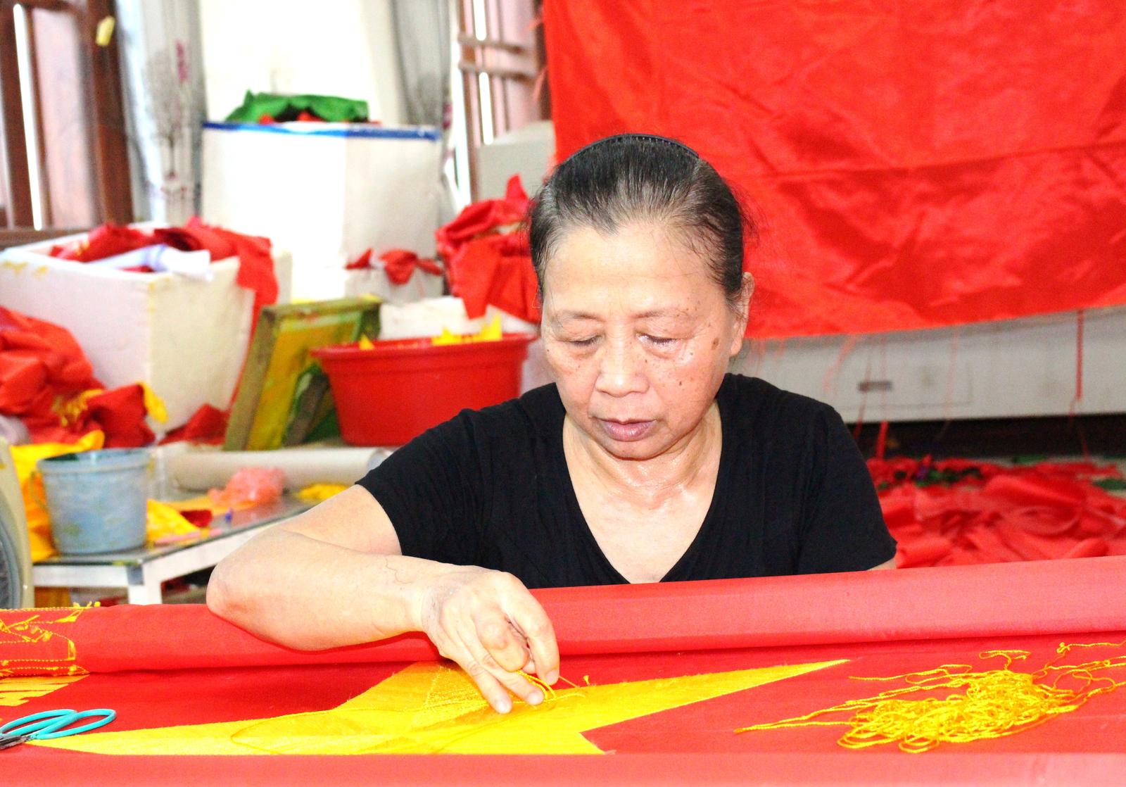 “Gia đình tôi có 10 anh, chị, em, trong đó, 3 người làm nghề truyền thống, nhưng giờ chỉ còn duy nhất tôi bám trụ. Bởi nghề may cờ không cho thu nhập cao, mà người làm cờ phải thực sự khéo léo, tỉ mẩn trong từng đường kim, mũi chỉ, do đó, phải ai thực sự đam mê mới gắn bó được với nghề”, chị Nhung tâm sự.