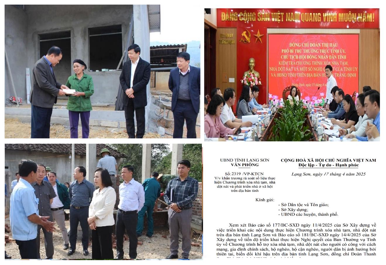 Văn phòng UBND tỉnh Lạng Sơn vừa có Văn bản số 2319/VP-KTCN, ngày 17/4/2025 về việc khẩn trương rà soát số liệu thực hiện Chương trình xóa nhà tạm, nhà dột nát và phát triển nhà ở xã hội trên địa bàn tỉnh.