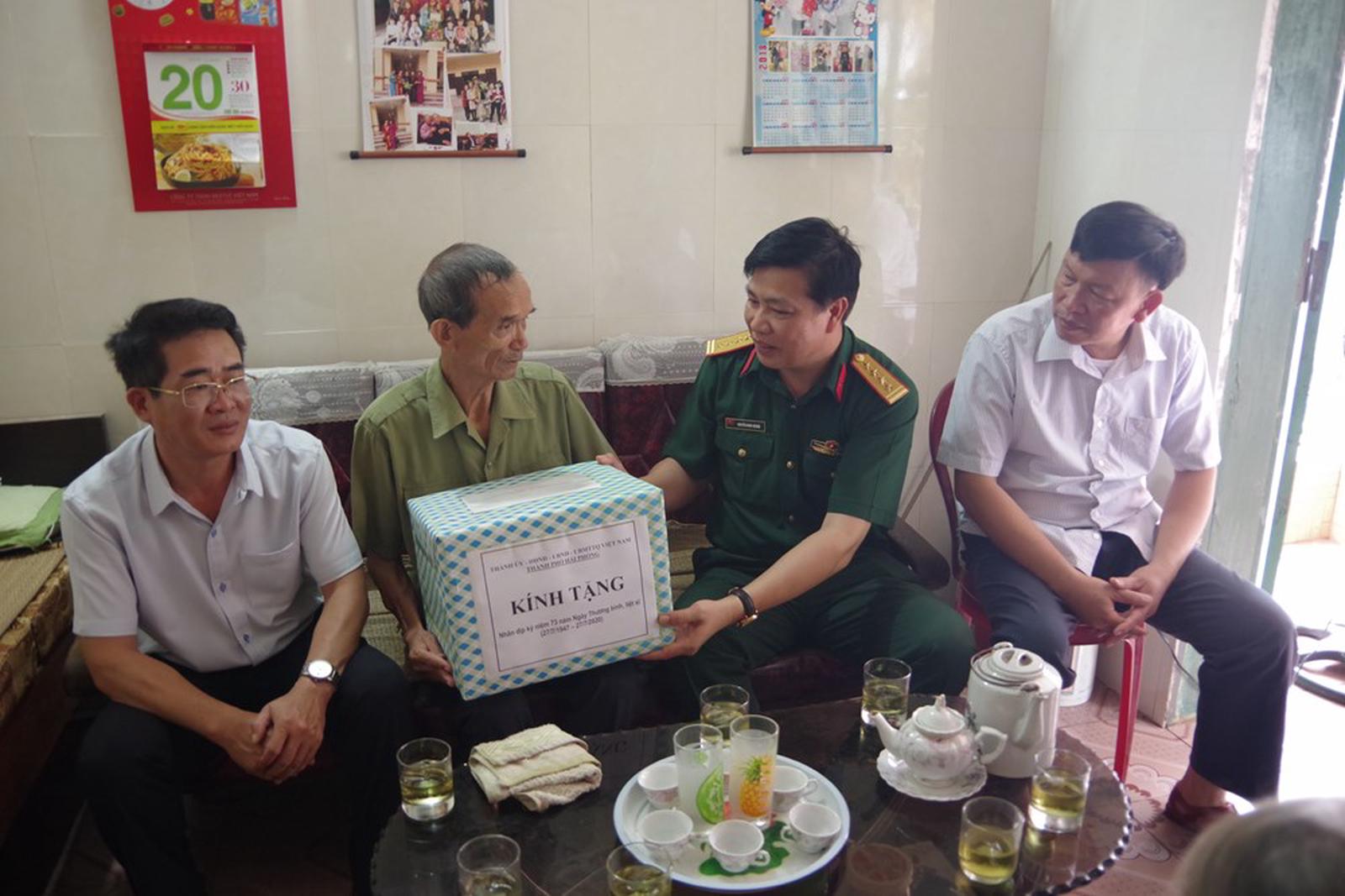 Đại tá Nguyễn Minh Quang - Chỉ huy trưởng Bộ Chỉ huy Quân sự thành phố thăm và tặng quà ông Lưu Đức Miện. Ảnh: Văn Minh