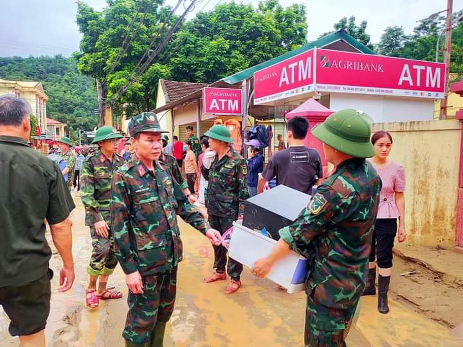 Cán bộ chiến sỹ cùng nhân dân có mặt giúp dân di dời tài sản, khắc phục lũ, lụt. Ảnh: Phan Thắng