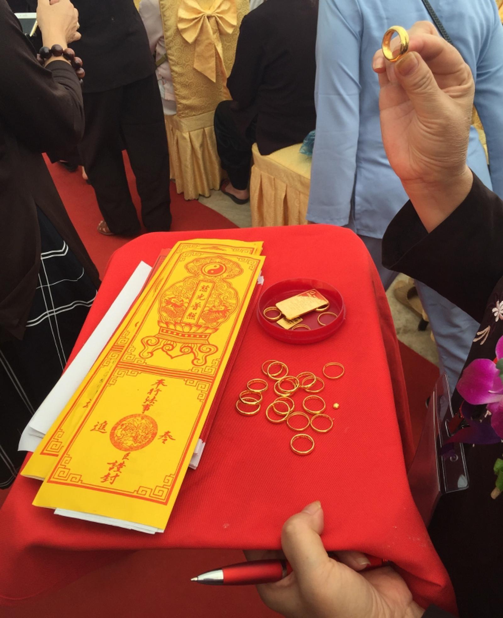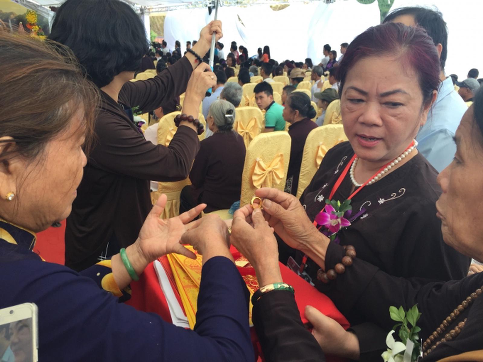 Các phật tử công đức vào tượng phật với hy vọng những khổ đau, hệ lụy sẽ tan biến. Ảnh: Quỳnh An.