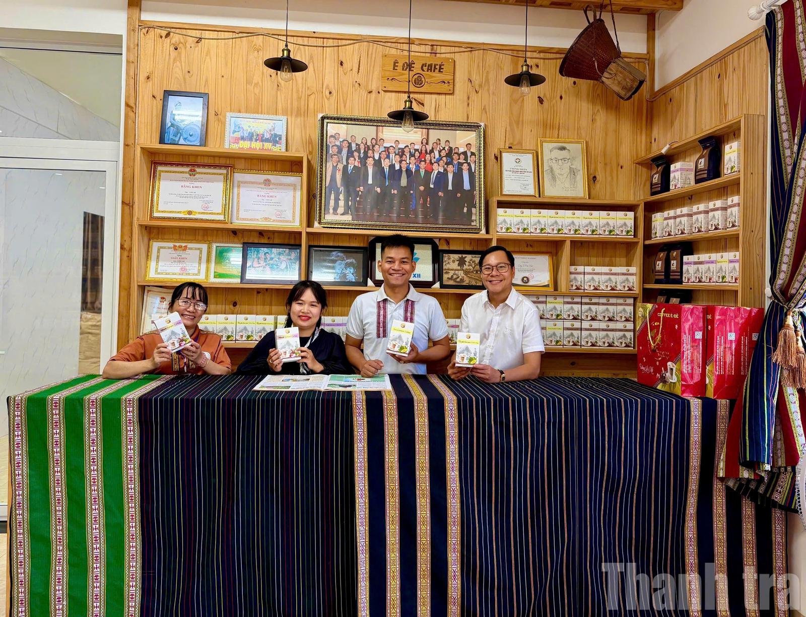 Anh Y Pốt Niê (thứ 3 từ trái sang) giới thiệu các sản phẩm cà phê đa dạng, đã được xuất khẩu và công nhận OCOP 4 sao. Ảnh: NG