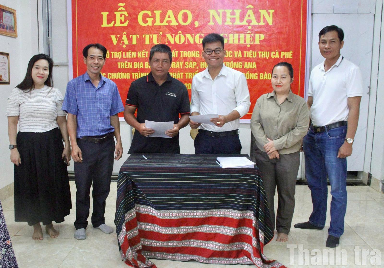 Lễ ký kết hợp tác và giao nhận vật tư nông nghiệp giữa Công ty TNHH Ê-đê Café với nông dân xã Ea Na (Đắk Lắk). Đây là nền tảng để triển khai chuỗi liên kết sản xuất cà phê hữu cơ bền vững trên địa bàn. Ảnh: NG