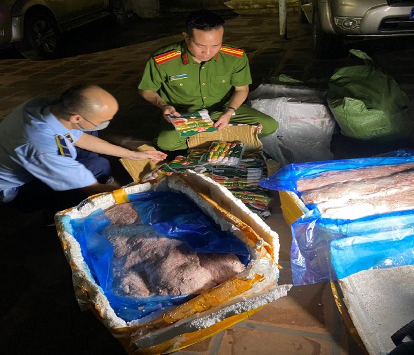 Theo Công an thành phố Hà Nội, trước thực trạng ngộ độc thực phẩm xảy ra ở nhiều nơi trong cả nước, tiềm ẩn nguy cơ cao những hiểm họa đối với sức khỏe người dân, thực hiện Tháng an toàn thực phẩm, các lực lượng chức năng Công an thành phố Hà Nội đã phát hiện nhiều vụ việc.Điển hình, khoảng 11h00 ngày 7/5/2024, Công an huyện Đông Anh phối hợp với Đội Quản lý thị trường số 9, kiểm tra cơ sở một kinh doanh tại thôn Cổ Điển, Hải Bối, Đông Anh. Tại thời điểm kiểm tra, cơ sở này có 1.900kg lá lách lợn đông lạnh, 1.000kg chân bò đông lạnh (tổng trọng lượng 2.900kg) được chứa trong các túi nilon, bao tải và bảo quản trong tủ đông lạnh, đang có dấu hiệu phân huỷ, bốc mùi hôi thối. Số hàng hóa trên với tổng giá niêm yết là 29.200.000 đồng.Tại thời điểm kiểm tra, chủ cơ sở không có giấy chứng nhận đăng ký kinh doanh, không xuất trình được hoá đơn, chứng từ chứng minh nguồn gốc số hàng hoá trên. Qua làm việc, chủ cơ sở khai nhận số hàng hóa trên được mua trôi nổi trên thị trường gom để bán lấy lời.Tổ công tác đã tạm giữ số hàng hoá trên để xử lý theo quy định pháp luật. Theo quy định tại Nghị định 98/2020/NĐ-CP ngày 26/8/2020 của Chính phủ hành vi vi phạm không có hoá đơn chứng từ chứng minh nguồn gốc, không đảm bảo vệ sinh an toàn thực phẩm sẽ bị phạt là 24.500.000 đồng và tịch thu, buộc tiêu huỷ 2.900kg hàng hoá trên. Lực lượng chức năng kiểm tra số hàng hóa không có nguồn gốc xuất xứ. Ảnh: Công an thành phố Hà Nội Tiếp đó, ngày 8/5/2024, Phòng Cảnh sát kinh tế - Công an thành phố Hà Nội phối hợp cùng Đội Quản lý thị trường số 14 - Cục Quản lý thị trường Hà Nội phát hiện và thu giữ hàng trăm cân lạp xưởng và nầm lợn nhập lậu, không có hóa đơn chứng từ.Quá trình kiểm tra đột xuất một địa điểm kinh doanh, tập kết thực phẩm tại phường Thanh Trì, quận Hoàng Mai, lực lượng chức năng đã thu giữ 1,5 tấn nầm lợn và 400 kg lạp xưởng. Bao bì các sản phẩm lạp xưởng đều in chữ nước ngoài. Chủ cơ sở khai nhận toàn bộ hàng hoá liên quan được thu mua trôi nổi trên thị trường nên hoàn toàn không có hóa đơn chứng từ.Đáng chú ý, số lạp xưởng này chủ yếu được đổ buôn cho các quán ăn kinh doanh trên vỉa hè, các cửa hàng tạp hóa…Theo Thiếu tá Nguyễn Văn Hiền, Đội 6 - Phòng Cảnh sát kinh tế - Công an thành phố Hà Nội, các loại thực phẩm này đều không được kiểm định về chất lượng vệ sinh an toàn thực phẩm, tuy nhiên lại bán “chạy” trên thị trường, nếu không bị phát hiện và thu giữ kịp thời thì có thể tiềm ẩn nguy cơ ảnh hưởng đến sức khoẻ người tiêu dùng. Triển khai tháng cao điểm về vệ sinh an toàn thực phẩm của thành phố, Phòng Cảnh sát kinh tế sẽ tiếp tục phối hợp các đơn vị chức năng đấu tranh, xử lý nghiêm các trường hợp vi phạm tương tự.