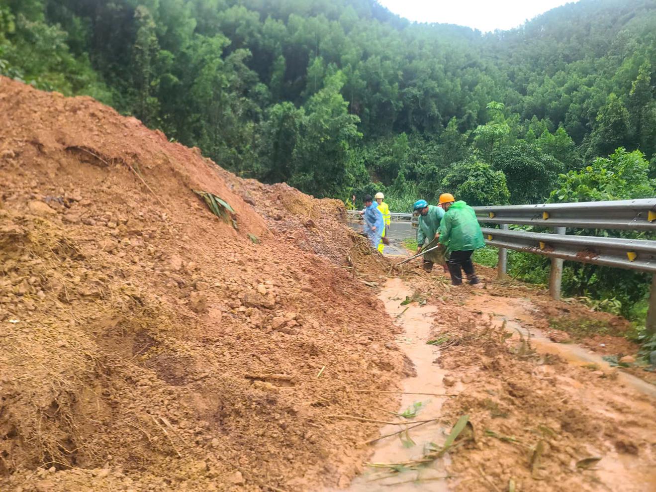 Đèo Phượng Hoàng (quốc lộ 26) bị sạt lở gây ách tắc cục bộ, lực lượng chức năng nỗ lực dọn đất đá để khơi thông tuyến đường. Ảnh: LT