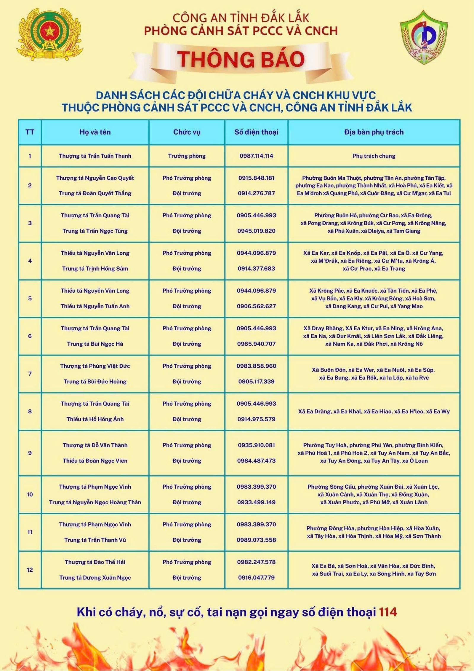 Công an tỉnh Đắk Lắk công bố danh sách lực lượng chữa cháy và cứu nạn cứu hộ trực 24/24 để sẵn sàng ứng phó sự cố trong mưa lũ. Ảnh: CA
