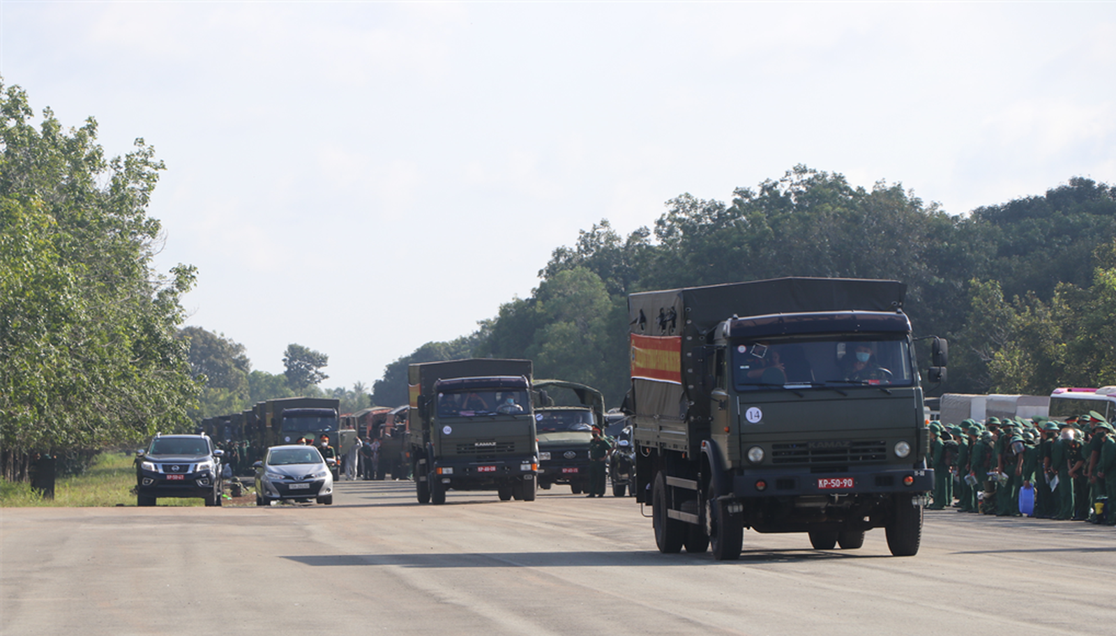 Từng đoàn xe sẽ đưa các cán bộ, chiến sĩ Quân khu 7 đến những khu vực cách ly, bệnh viện dã chiến, các trạm chốt trên địa bàn TP.HCM. Ảnh: Quân khu 7