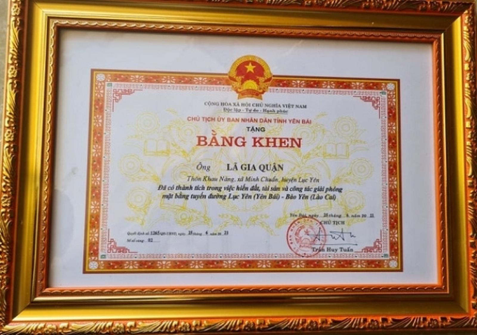 Bằng khen của ông Lã Gia Quận. Ảnh: Bùi Bình