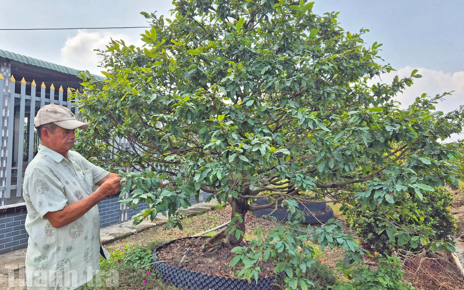 Ông Phạm Văn Tư (ấp Mai Vàng, xã Tân Tây) chăm sóc mai. Ảnh: Cảnh Nhật