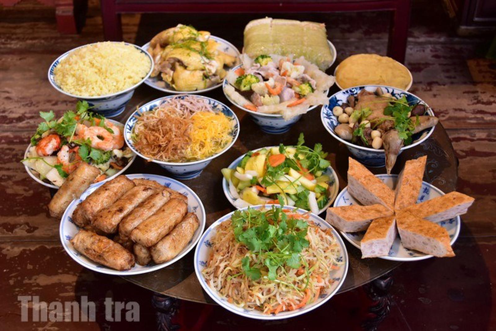 Nhiều mâm cỗ được chuẩn bị sẵn nhưng vẫn cho phép gia chủ tự bày biện, sắp xếp lại theo không gian bàn thờ của từng gia đình, giúp giữ được sự trang trọng và cảm giác ấm cúng trong nghi lễ. Ảnh: TH