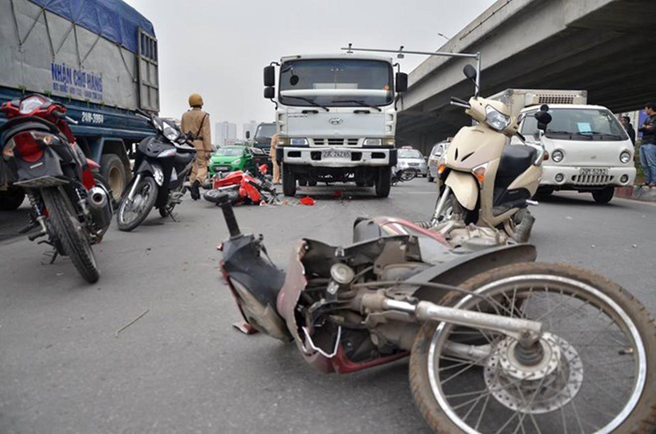 Nhiều xe máy ngã la liệt sau cú đâm của xe bồn (Ảnh: Cộng tác viên Hà Thành)