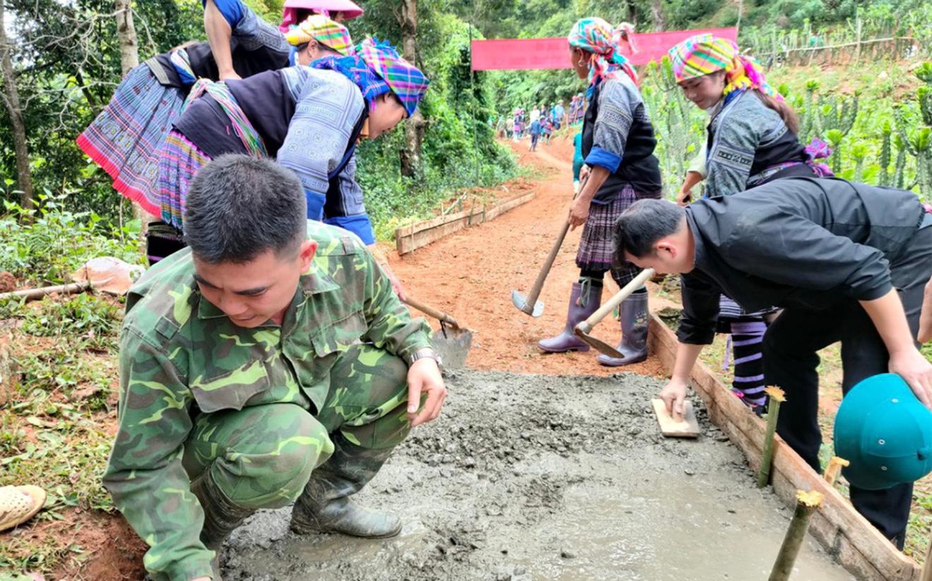 Nhân dân bản Dào Xa, xã Lao Chải bê tông hóa đường giao thông nông thôn. Ảnh: Thanh Tân
