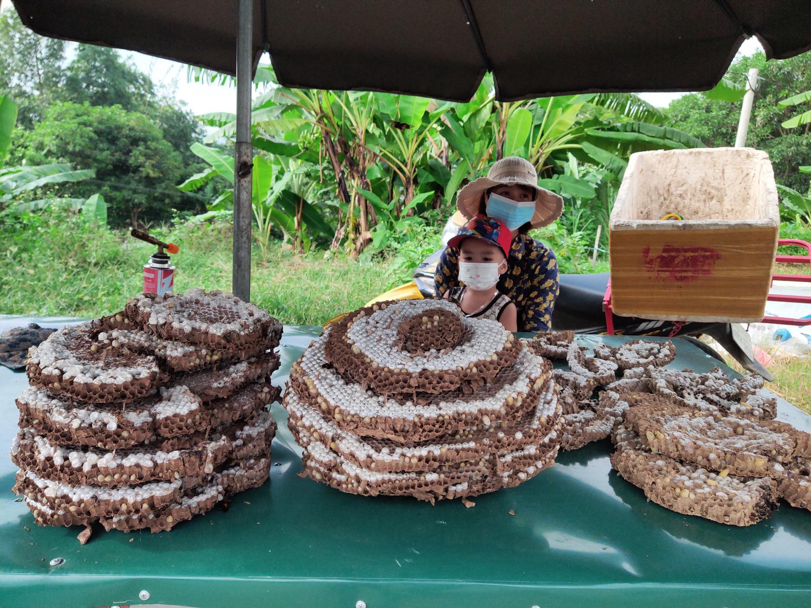 Trên chiếc nong lớn để giữa sân gạch, tổ ong đã được xé thành gần chục mảng như những chiếc bánh đa lớn đều tăm tắp những ô nhỏ hình lục lăng với những mũ trắng trám trên miệng. Tỷ mẩn bóc từng mũ trám, nhặt những ấu trùng ong trắng ngà, căng mọng với kích cỡ như đầu đũa bỏ vào chiếc rổ tre để cạnh là ông Hoàng Văn Tư, bố đẻ của anh.