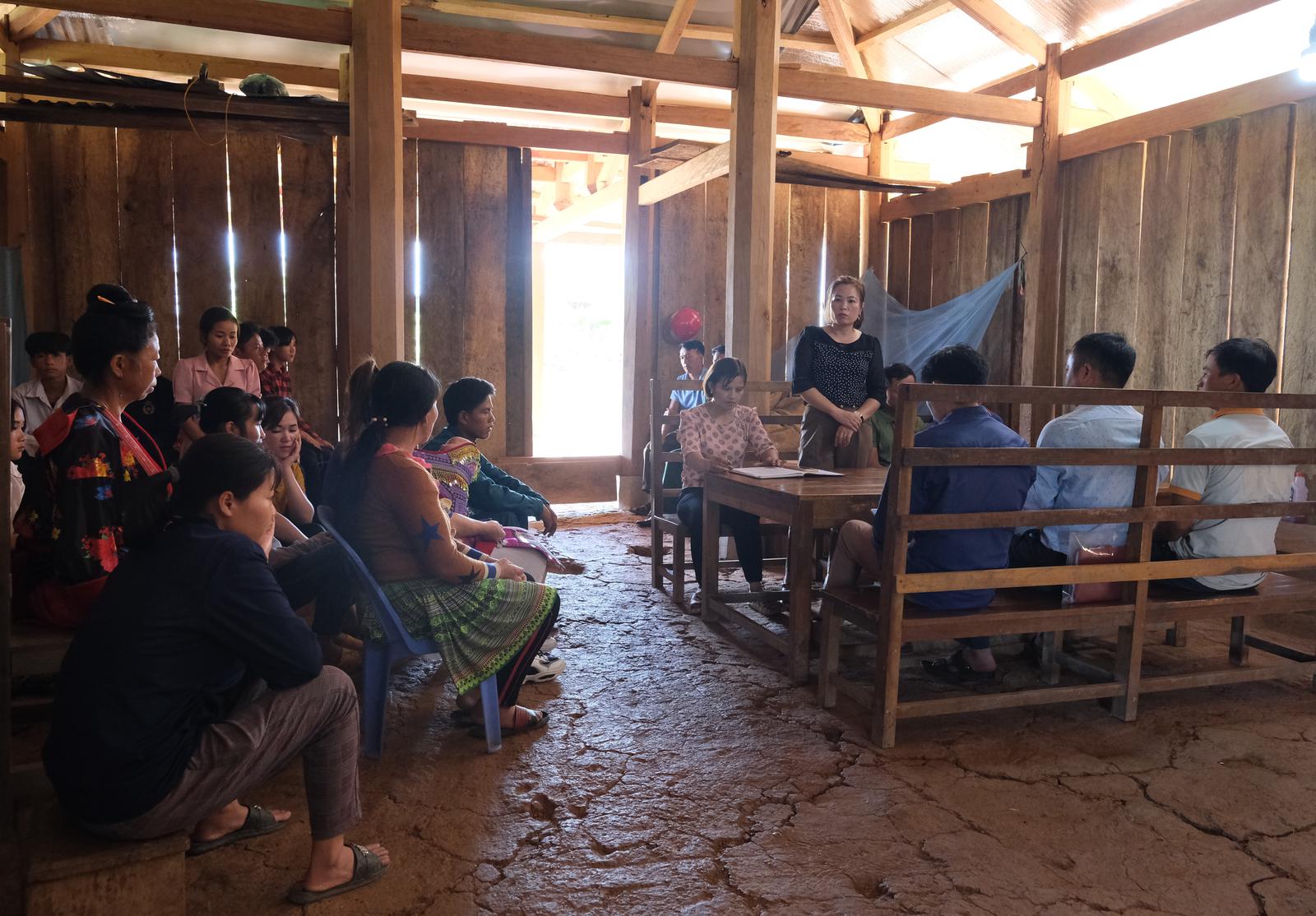 Trong ngôi nhà gỗ tại bản Nà Bủng 3, xã Nà Bủng, người dân chăm chú nghe chị Đinh Thị Hà, Phó Bí thư Thường trực Đảng ủy xã Nà Bủng tuyên truyền các kiến thức về pháp luật, lồng ghép với đó là sự nguy hiểm và các biện pháp phòng tránh dịch bệnh Covid-19. Có đoạn chị Hà nói bằng tiếng phổ thông, có đoạn chị phiên dịch ra tiếng Mông rồi phát tờ rơi có hình ảnh để người dân dễ hiểu.