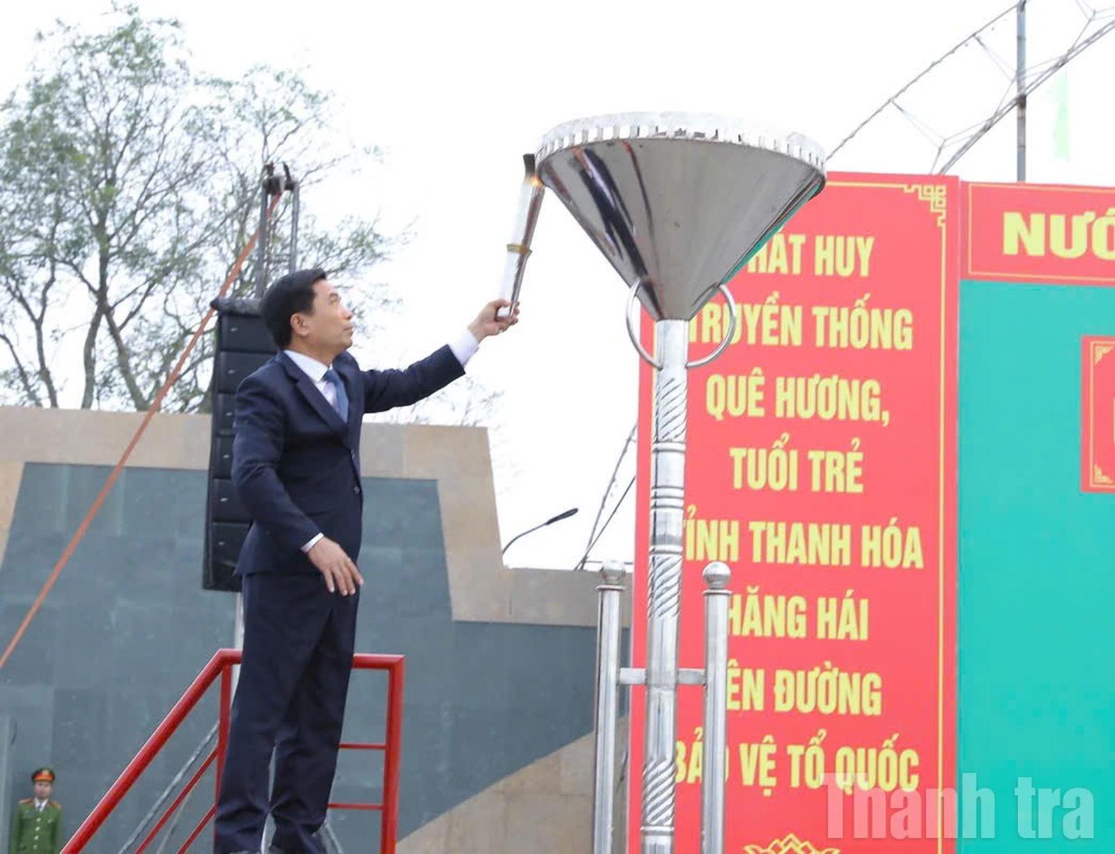 Bí thư Tỉnh ủy Thanh Hóa Nguyễn Doãn Anh thắp lửa truyền thống trong ngày hội giao nhận quân. Ảnh: Văn Thanh
