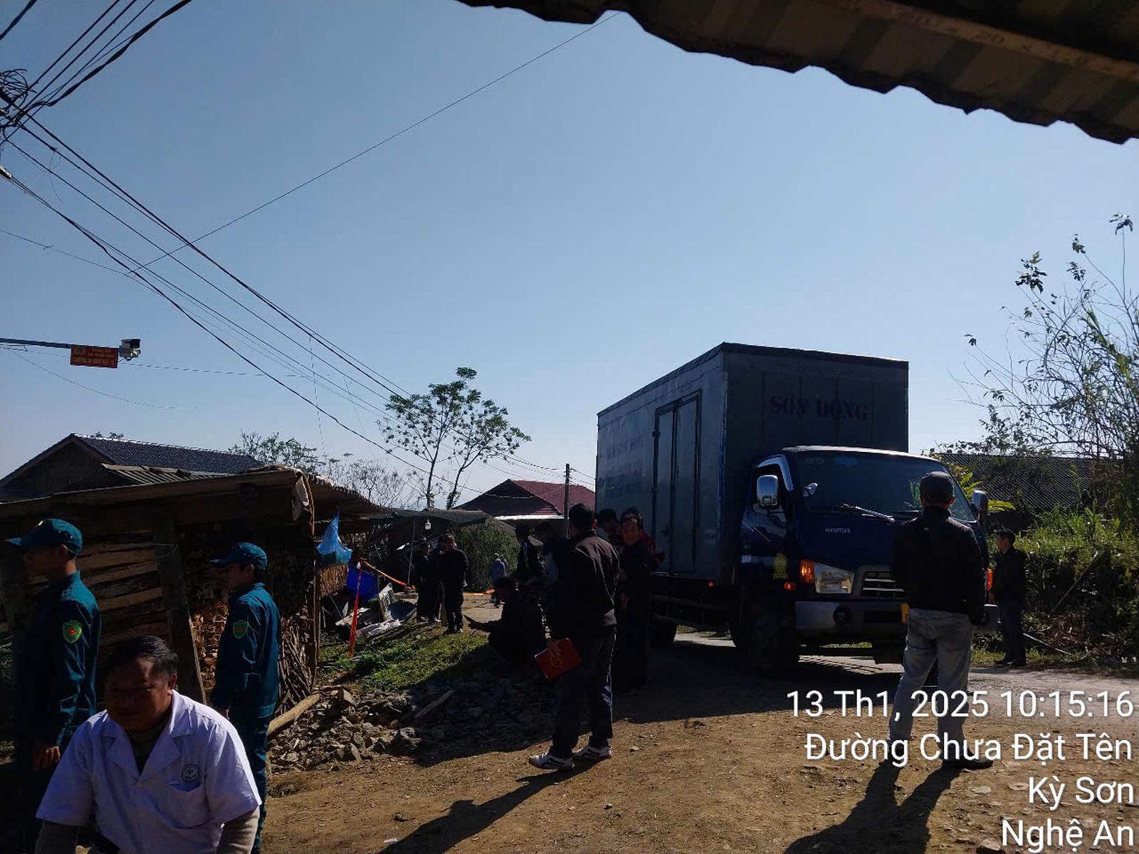Trước đó, vào khoảng 18h ngày 12/1 tại Km 21+800 tỉnh lộ 543D, thuộc bản Thăm Hín, xã Nậm Càn. Đây là xã biên giới, giáp biên với Lào, cách trung tâm huyện Kỳ Sơn khoảng 60 km. Lúc này, xe ô tô tải chở lá dong mang biển kiểm soát 37C-537.03 (loại xe 1,5 tấn) đang lưu thông theo hướng đi từ xã Na Ngoi về xã Nậm Càn do tài xế Vũ Văn Hảo (sinh năm 1982, trú tại bản Con Mương, xã Lưu Kiền, huyện Tương Dương) điều khiển xuống dốc bị mất lái đâm vào nhà dân.